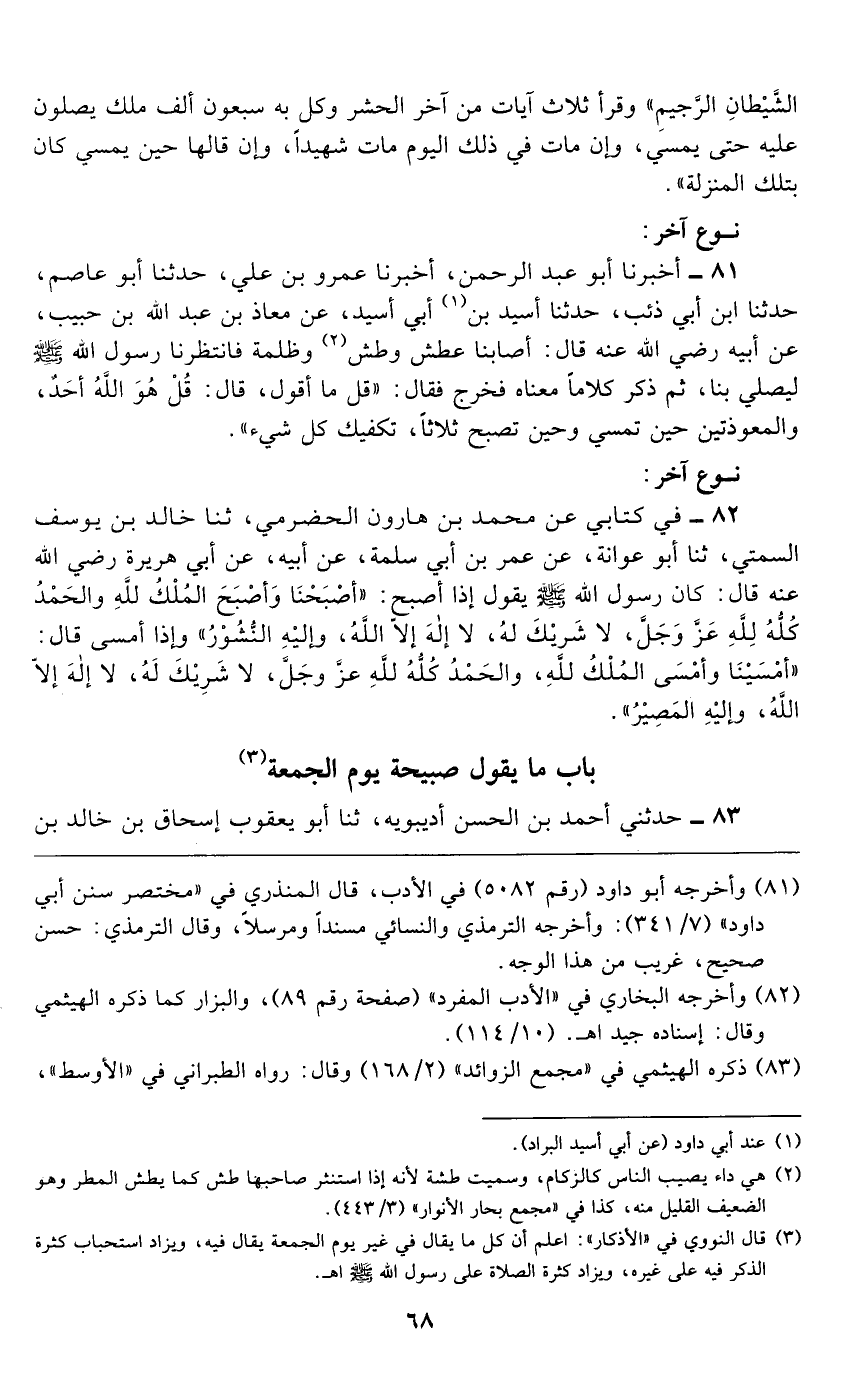 73 - أَخْبَرَنَا أَبُو يَعْلَى، أَخْبَرَنَا شُجَاعُ بْنُ مَخْلَدٍ، حَدَّثَنَا يَحْيَى بْنُ حَمَّادٍ، حَدَّثَنَا الْأَغْلَبُ بْنُ تَمِيمٍ، عَنْ مَخْلَدِ بْنِ هُزَيْلٍ، عَنْ عَبْدِ الرَّحْمَنِ يَعْنِي ابْنَ عَبْدِ اللَّهِ بْنِ عُمَرَ الْمَدَنِيَّ عَنْ عَبْدِ اللَّهِ بْنِ عُمَرَ، عَنْ عُثْمَانَ بْنِ عَفَّانَ، رَضِيَ اللَّهُ عَنْهُمْ أَنَّهُ سَأَلَ رَسُولَ اللَّهِ صَلَّى اللهُ عَلَيْهِ وَسَلَّمَ عَنْ تَفْسِيرِ: {لَهُ مَقَالِيدُ السَّمَوَاتِ وَالْأَرْضِ} ، فَقَالَ: " مَا سَأَلَنِي عَنْهَا أَحَدٌ قَبْلَكَ، تَفْسِيرُهُ -[69]-: §لَا إِلَهَ إِلَّا اللَّهُ، وَاللَّهُ أَكْبَرُ، وَسُبْحَانَ اللَّهِ وَبِحَمْدِهِ، وَأَسْتَغْفِرُ اللَّهَ، وَلَا حَوْلَ وَلَا قُوَّةَ إِلَّا بِاللَّهِ، الْأَوَّلُ وَالْآخِرُ وَالظَّاهِرُ وَالْبَاطِنُ، بِيَدِهِ الْخَيْرُ، يُحْيِي وَيُمِيتُ، وَهُوَ عَلَى كُلِّ شَيْءٍ قَدِيرٌ، مَنْ قَالَهَا إِذَا أَصْبَحَ عَشْرَ مَرَّاتٍ أُعْطِيَ سِتَّ خِصَالٍ: أَمَّا أَوَّلُهُنَّ فَيُحْرَسُ مِنْ إِبْلِيسِ وَجُنُودِهِ، وَأَمَّا الثَّانِيَةُ فَيُعْطَى قِنْطَارًا مِنَ الْأَجْرِ، وَأَمَّا الثَّالِثَةُ فَيَرْفَعُ لَهُ دَرَجَةً فِي الْجَنَّةِ، وَأَمَّا الرَّابِعَةُ فَيُزَوَّجُ مِنَ الْحُورِ الْعِينِ، وَأَمَّا الْخَامِسَةُ فَيَحْضُرُهَا اثْنَا عَشَرَ أَلْفَ مَلَكٍ، وَأَمَّا السَّادِسَةُ فَلَهُ مِنَ الْأَجْرِ كَمَنْ يَقْرَأُ التَّوْرَاةَ وَالْإِنْجِيلَ وَالزَّبُورَ وَالْفُرْقَانَ، وَلَهُ مَعَ هَذَا يَا عُثْمَانُ كَمَنْ حَجَّ وَاعْتَمَرَ، فَقُبِلَتْ حَجَّتُهُ وَعُمْرَتُهُ، فَإِنْ مَاتَ مِنْ يَوْمِهِ طُبِعَ بِطَابِعِ الشُّهَدَاءِ "
