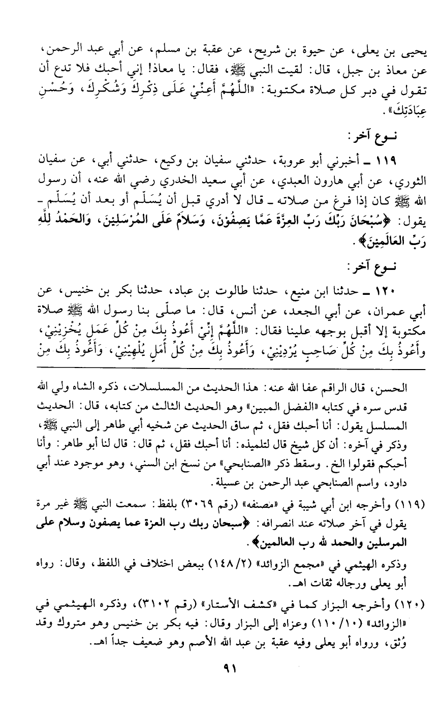 99 - أَخْبَرَنَا مُحَمَّدُ بْنُ جَرِيرٍ، حَدَّثَنَا أَبُو كُرَيْبٍ، حَدَّثَنَا عُثْمَانُ بْنُ سَعِيدٍ، حَدَّثَنَا عَمْرٌو أَبُو حَفْصٍ، عَنْ قَيْسِ بْنِ مُسْلِمٍ، عَنْ طَارِقِ بْنِ شِهَابٍ، عَنْ عَبْدِ اللَّهِ، رَضِيَ اللَّهُ عَنْهُ أَنَّ النَّبِيَّ صَلَّى اللهُ عَلَيْهِ وَسَلَّمَ قَالَ: " §مَا مِنْ مُسْلِمٍ يَقُولُ إِذَا سَمِعَ النِّدَاءَ بِالصَّلَاةِ، فَكَبَّرَ الْمُنَادِي فَيُكَبِّرُ، وَيَشْهَدُ أَنْ لَا إِلَهَ إِلَّا اللَّهُ فَيَشْهَدُ أَنْ لَا إِلَهَ إِلَّا اللَّهُ، وَأَنَّ مُحَمَّدًا رَسُولُ اللَّهِ، فَيَشْهَدُ عَلَى ذَلِكَ، وَيَقُولُ: اللَّهُمَّ أَعْطِ مُحَمَّدًا الْوَسِيلَةَ، وَاجْعَلْ فِي الْعِلِّيِّينَ دَرَجَتَهُ، وَفِي الْمُصْطَفَيْنِ تَحِيَّتَهُ، وَفِي الْمُقَرَّبِينَ ذِكْرَهُ، إِلَّا وَجَبَتْ لَهُ الشَّفَاعَةُ مِنِّي يَوْمَ الْقِيَامَةِ "