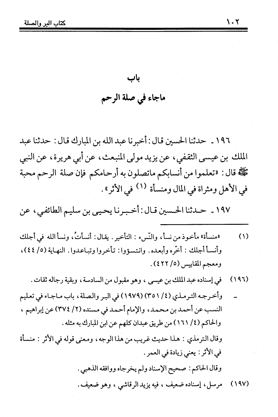 196 - حَدَّثَنَا الْحُسَيْنُ قَالَ: أَخْبَرَنَا عَبْدُ اللَّهِ بْنُ الْمُبَارَكِ، قَالَ: حَدَّثَنَا عَبْدُ الْمَلِكِ بْنُ عِيسَى الثَّقَفِيُّ، عَنْ يَزِيدَ، مَوْلَى الْمُنْبَعِثِ، عَنْ أَبِي هُرَيْرَةَ، عَنِ النَّبِيِّ صَلَّى اللهُ عَلَيْهِ وَسَلَّمَ قَالَ: «§تَعَلَّمُوا مِنْ أَنْسَابِكُمْ مَا تَصِلُونَ بِهِ أَرْحَامَكُمْ فَإِنَّ صِلَةَ الرَّحِمِ مَحَبَّةٌ فِي الْأَهْلِ وَمَثْرَاةٌ فِي الْمَالِ وَمَنْسَأَةٌ فِي الْأَثَرِ»