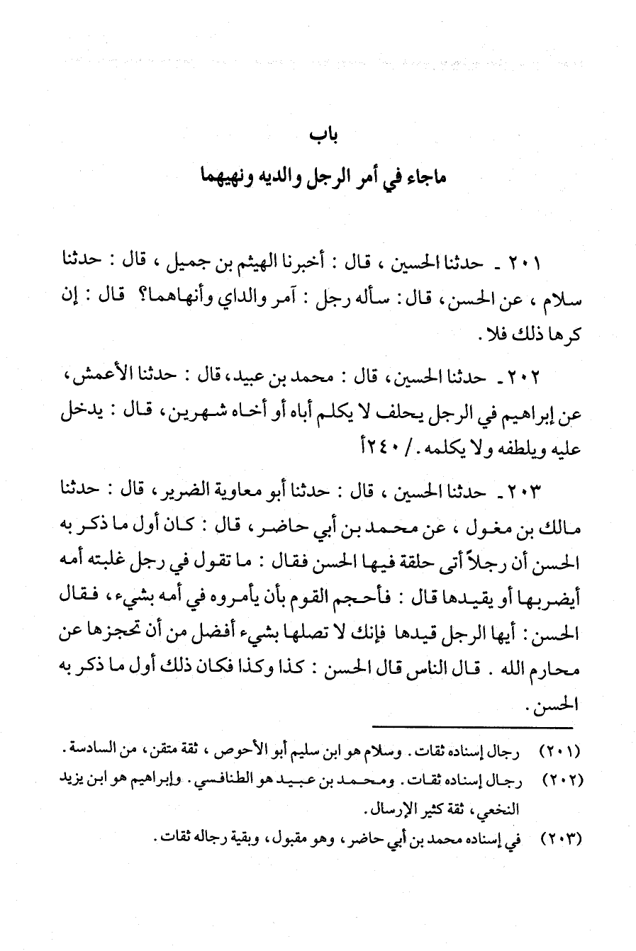 201 - حَدَّثَنَا الْحُسَيْنُ قَالَ: أَخْبَرَنَا الْهَيْثَمُ بْنُ جَمِيلٍ، قَالَ: حَدَّثَنَا سَلَّامٌ، عَنِ الْحَسَنِ، قَالَ: سَأَلَهُ رَجُلٌ: آمُرُ وَالِدَايَ وَأَنْهَاهُمَا؟ قَالَ: «§إِنْ كَرِهَا ذَلِكَ فَلَا»