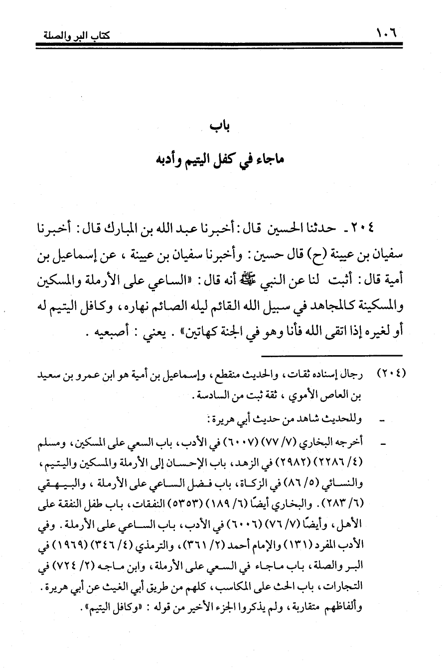 204 - حَدَّثَنَا الْحُسَيْنُ قَالَ: أَخْبَرَنَا عَبْدُ اللَّهِ بْنُ الْمُبَارَكِ، قَالَ: أَخْبَرَنَا سُفْيَانُ بْنُ عُيَيْنَةَ، ح قَالَ حُسَيْنٌ: وَأَخْبَرَنَا سُفْيَانُ بْنُ عُيَيْنَةَ، عَنْ إِسْمَاعِيلَ بْنِ أُمَيَّةَ، قَالَ: اثْبُتْ لَنَا عَنِ النَّبِيِّ صَلَّى اللهُ عَلَيْهِ وَسَلَّمَ أَنَّهُ قَالَ: «§السَّاعِي عَلَى الْأَرْمَلَةِ وَالْمِسْكِينِ وَالْمِسْكِينَةِ كَالْمُجَاهِدِ فِي سَبِيلِ اللَّهِ الْقَائِمِ لَيْلَهُ الصَّائِمِ نَهَارَهُ، وَكَافِلُ الْيَتِيمِ لَهُ أَوْ لِغَيْرِهِ إِذَا اتَّقَى اللَّهَ فَأَنَا وَهُوَ فِي الْجَنَّةِ كَهَاتَيْنِ» يَعْنِي أُصْبُعَيْهِ