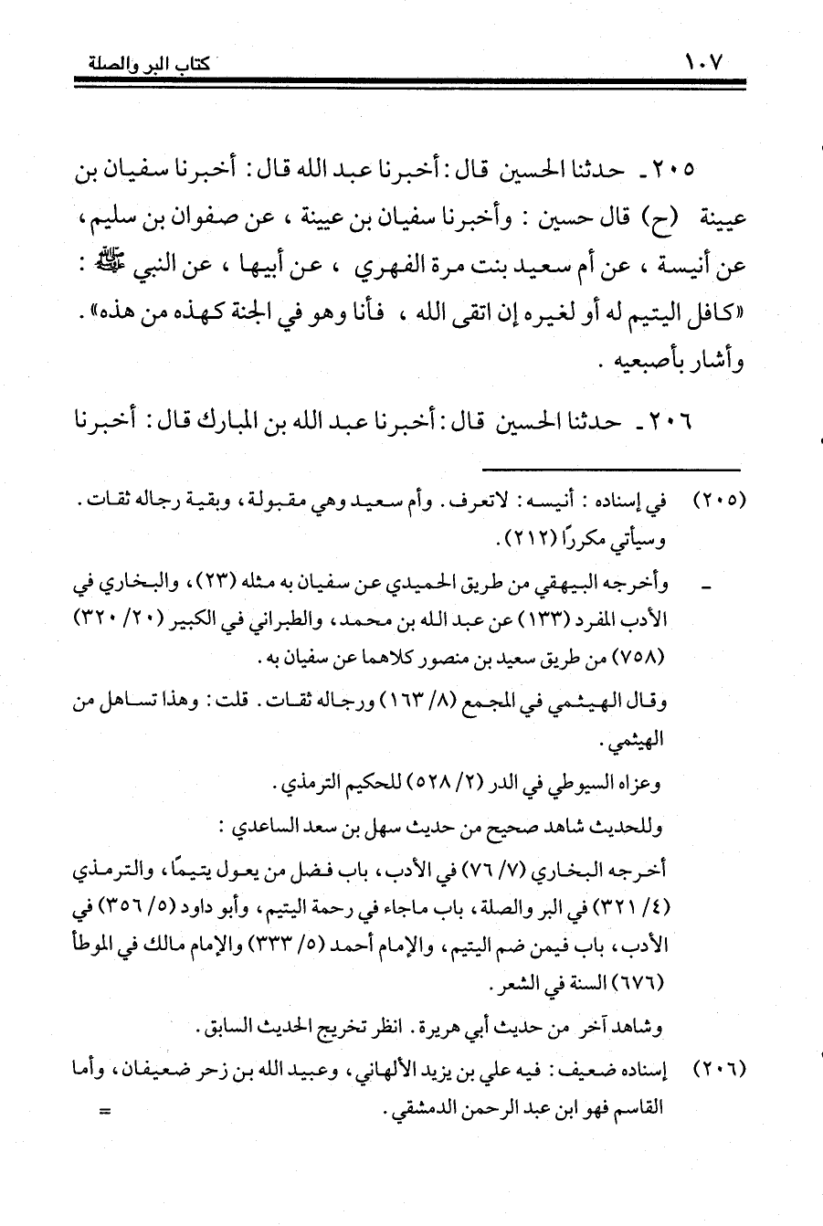 205 - حَدَّثَنَا الْحُسَيْنُ قَالَ: أَخْبَرَنَا عَبْدُ اللَّهِ، قَالَ: أَخْبَرَنَا سُفْيَانُ بْنُ عُيَيْنَةَ، (ح) قَالَ حُسَيْنٌ: وَأَخْبَرَنَا سُفْيَانُ بْنُ عُيَيْنَةَ، عَنْ صَفْوَانَ بْنِ سُلَيْمٍ، عَنْ أُنَيْسَةَ، عَنْ أُمِّ سَعِيدٍ بِنْتِ مُرَّةَ الْفِهْرِيِّ، عَنْ أَبِيهَا، عَنِ النَّبِيِّ صَلَّى اللهُ عَلَيْهِ وَسَلَّمَ: «§كَافِلُ الْيَتِيمِ لَهُ أَوْ لِغَيْرِهِ إِنِ اتَّقَى اللَّهَ فَأَنَا وَهُوَ فِي الْجَنَّةِ كَهَذِهِ مِنْ هَذِهِ - وَأَشَارَ بِأُصْبُعَيْهِ -»