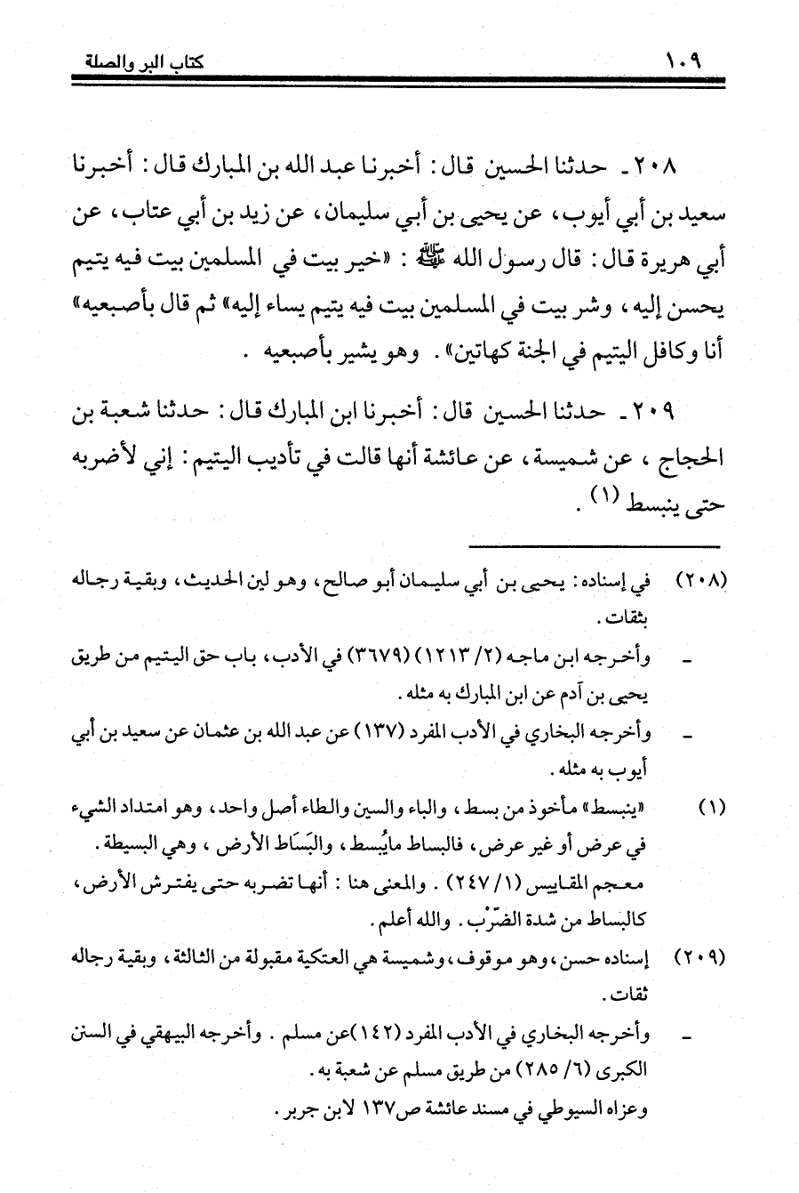 209 - حَدَّثَنَا الْحُسَيْنُ قَالَ: أَخْبَرَنَا ابْنُ الْمُبَارَكِ، قَالَ: حَدَّثَنَا شُعْبَةُ بْنُ الْحَجَّاجِ، عَنْ شُمَيْسَةَ، عَنْ عَائِشَةَ أَنَّهَا قَالَتْ فِي تَأْدِيبِ الْيَتِيمِ: «§إِنِّي لَأَضْرِبُهُ حَتَّى يَنْبَسِطَ»