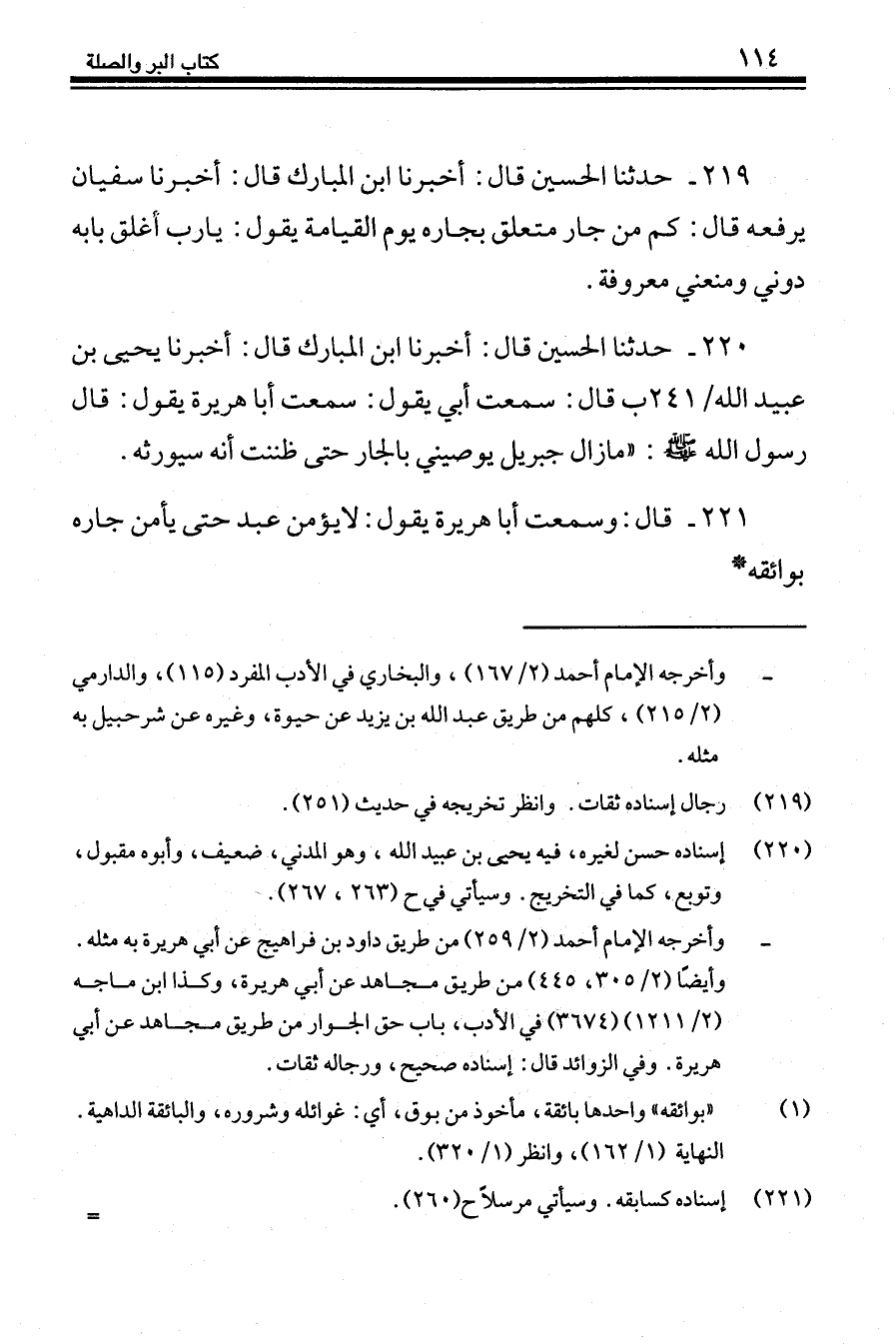 219 - حَدَّثَنَا الْحُسَيْنُ قَالَ: أَخْبَرَنَا ابْنُ الْمُبَارَكِ، قَالَ: أَخْبَرَنَا سُفْيَانُ يَرْفَعُهُ، قَالَ: " §كَمْ مِنْ جَارٍ مُتَعَلِّقٌ بِجَارِهِ يَوْمَ الْقِيَامَةِ يَقُولُ: يَا رَبِّ أَغْلَقَ بَابَهُ دُونِي وَمَنَعَنِي مَعْرُوفَهُ "