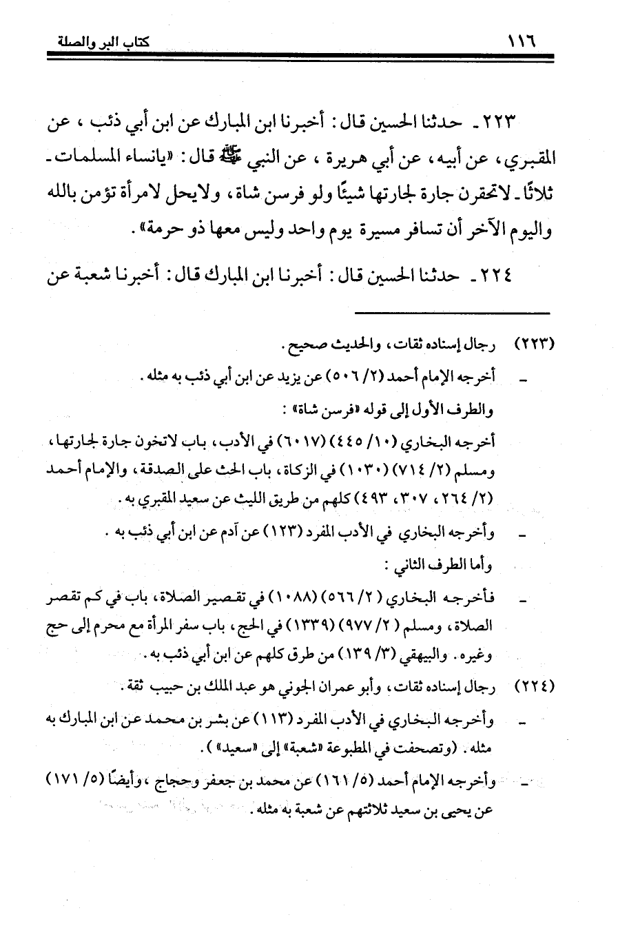 223 - حَدَّثَنَا الْحُسَيْنُ قَالَ: أَخْبَرَنَا ابْنُ الْمُبَارَكِ، عَنِ ابْنِ أَبِي ذِئْبٍ، عَنِ الْمَقْبُرِيِّ، عَنْ أَبِيهِ، عَنْ أَبِي هُرَيْرَةَ، عَنِ النَّبِيِّ صَلَّى اللهُ عَلَيْهِ وَسَلَّمَ قَالَ: «يَا نِسَاءَ الْمُسْلِمَاتِ - ثَلَاثًا - §لَا تَحْقِرَنَّ جَارَةٌ لِجَارَتِهَا شَيْئًا وَلَوْ فِرْسِنَ شَاةٍ، وَلَا يَحِلُّ لِامْرَأَةٍ تُؤْمِنُ بِاللَّهِ وَالْيَوْمِ الْآخِرِ أَنْ تُسَافِرَ مَسِيرَةَ يَوْمٍ وَاحِدٍ وَلَيْسَ مَعَهَا ذُو حُرْمَةٍ»