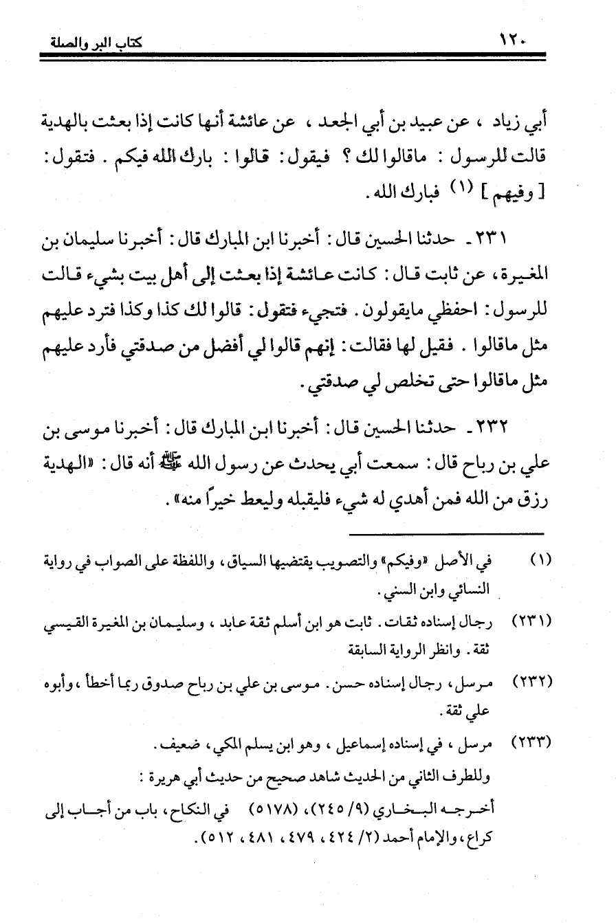 231 - حَدَّثَنَا الْحُسَيْنُ قَالَ: أَخْبَرَنَا ابْنُ الْمُبَارَكِ، قَالَ: أَخْبَرَنَا سُلَيْمَانُ بْنُ الْمُغِيرَةِ، عَنْ ثَابِتٍ، قَالَ: كَانَتْ عَائِشَةُ إِذَا بَعَثَتْ إِلَى أَهْلِ بَيْتٍ بِشَيْءٍ قَالَتْ لِلرَّسُولِ: «احْفَظِي مَا يَقُولُونَ» . فَتَجِيءُ فَتَقُولُ: قَالُوا لَكِ كَذَا وَكَذَا، فَتُرَدُّ عَلَيْهِمْ مِثْلَ مَا قَالُوا، فَقِيلَ لَهَا فَقَالَتْ: «§إِنَّهُمْ قَالُوا لِي أَفْضَلَ مِنْ صَدَقَتِي فَأَرُدُّ عَلَيْهِمْ مِثْلَ مَا قَالُوا حَتَّى تَخْلُصَ لِي صَدَقَتِي»