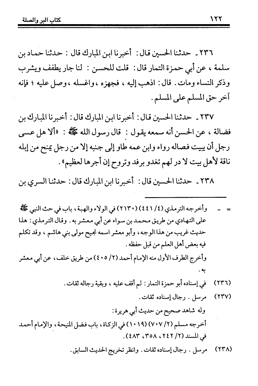 237 - حَدَّثَنَا الْحُسَيْنُ قَالَ: أَخْبَرَنَا ابْنُ الْمُبَارَكِ، قَالَ: أَخْبَرَنَا الْمُبَارَكُ بْنُ فَضَالَةَ، عَنِ الْحَسَنِ، أَنَّهُ سَمِعَهُ يَقُولُ: قَالَ رَسُولُ اللَّهِ صَلَّى اللهُ عَلَيْهِ وَسَلَّمَ: «§أَلَا هَلْ عَسَى رَجُلٌ أَنْ يَبِيتَ فِصَالُهُ رِوَاءً وَابْنُ عَمِّهِ طَاوٍ إِلَى جَنْبِهِ، أَلَا مِنْ رَجُلٍ يَمْنَحُ مِنْ إِبِلِهِ نَاقَةً لِأَهْلِ بَيْتٍ لَا دُرَّ لَهُمْ تَغْدُو بِرَفْدٍ وَتَرُوحُ إِنَّ أَجْرَهَا لَعَظِيمٌ»