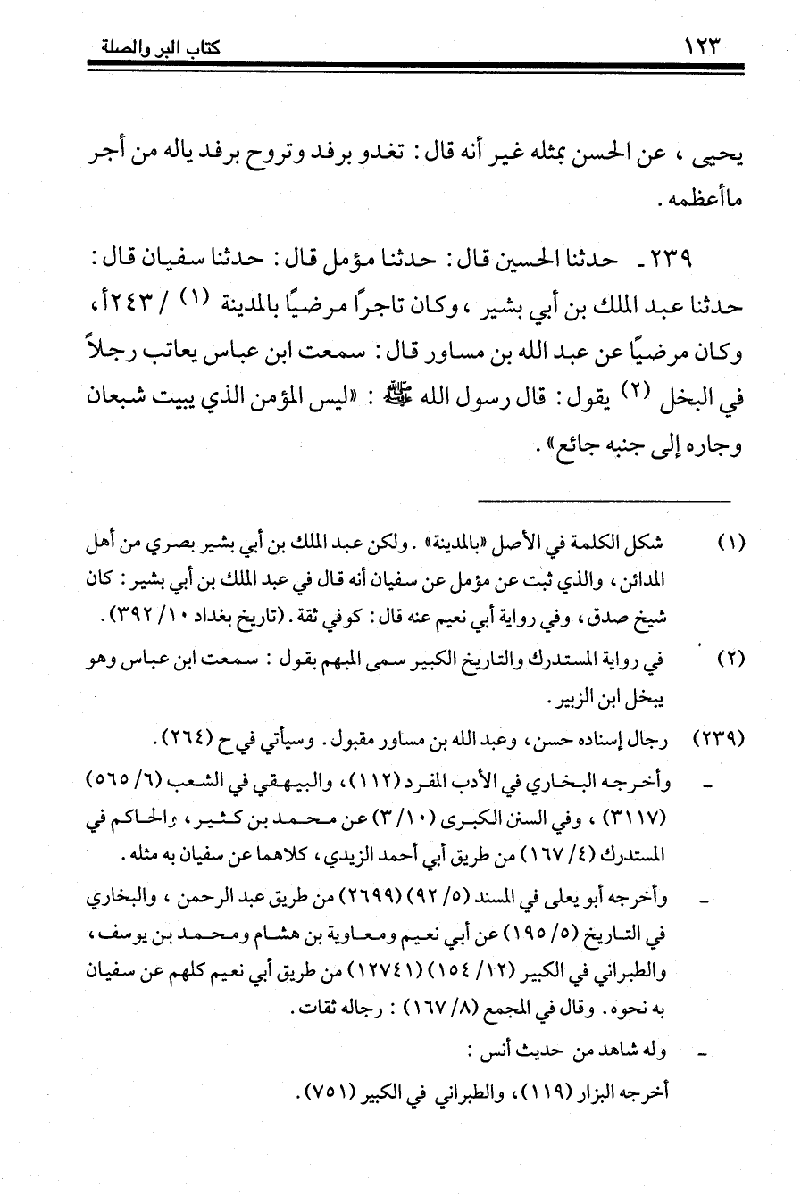 239 - حَدَّثَنَا الْحُسَيْنُ قَالَ: حَدَّثَنَا مُؤَمَّلٌ، قَالَ: حَدَّثَنَا سُفْيَانُ، قَالَ: حَدَّثَنَا عَبْدُ الْمَلِكِ بْنُ أَبِي بَشِيرٍ، وَكَانَ تَاجِرًا مَرْضِيًّا بِالْمَدِينَةِ وَكَانَ مَرْضِيًّا , عَنْ عَبْدِ اللَّهِ بْنِ مُسَاوِرٍ، قَالَ: سَمِعْتُ ابْنَ عَبَّاسٍ، يُعَاتِبُ رَجُلًا فِي الْبُخْلِ يَقُولُ: قَالَ رَسُولُ اللَّهِ صَلَّى اللهُ عَلَيْهِ وَسَلَّمَ: «§لَيْسَ الْمُؤْمِنُ الَّذِي يَبِيتُ شَبْعَانَ وَجَارُهُ إِلَى جَنْبِهِ جَائِعٌ»