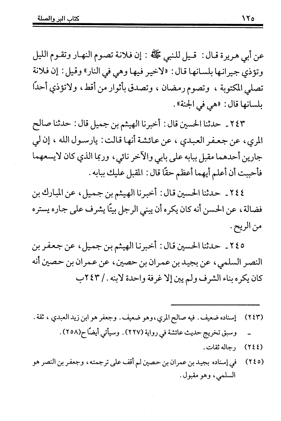 245 - حَدَّثَنَا الْحُسَيْنُ قَالَ: أَخْبَرَنَا الْهَيْثَمُ بْنُ جَمِيلٍ، عَنْ جَعْفَرِ بْنِ النَّصْرِ السُّلَمِيِّ، عَنْ بُجَيْدِ بْنِ عِمْرَانَ بْنِ حُصَيْنٍ، عَنْ عِمْرَانَ بْنِ حُصَيْنٍ، أَنَّهُ كَانَ «§يَكْرَهُ بِنَاءَ الشُّرَفِ وَلَمْ يَبْنِ إِلَّا غُرْفَةً وَاحِدَةً لِابْنِهِ»