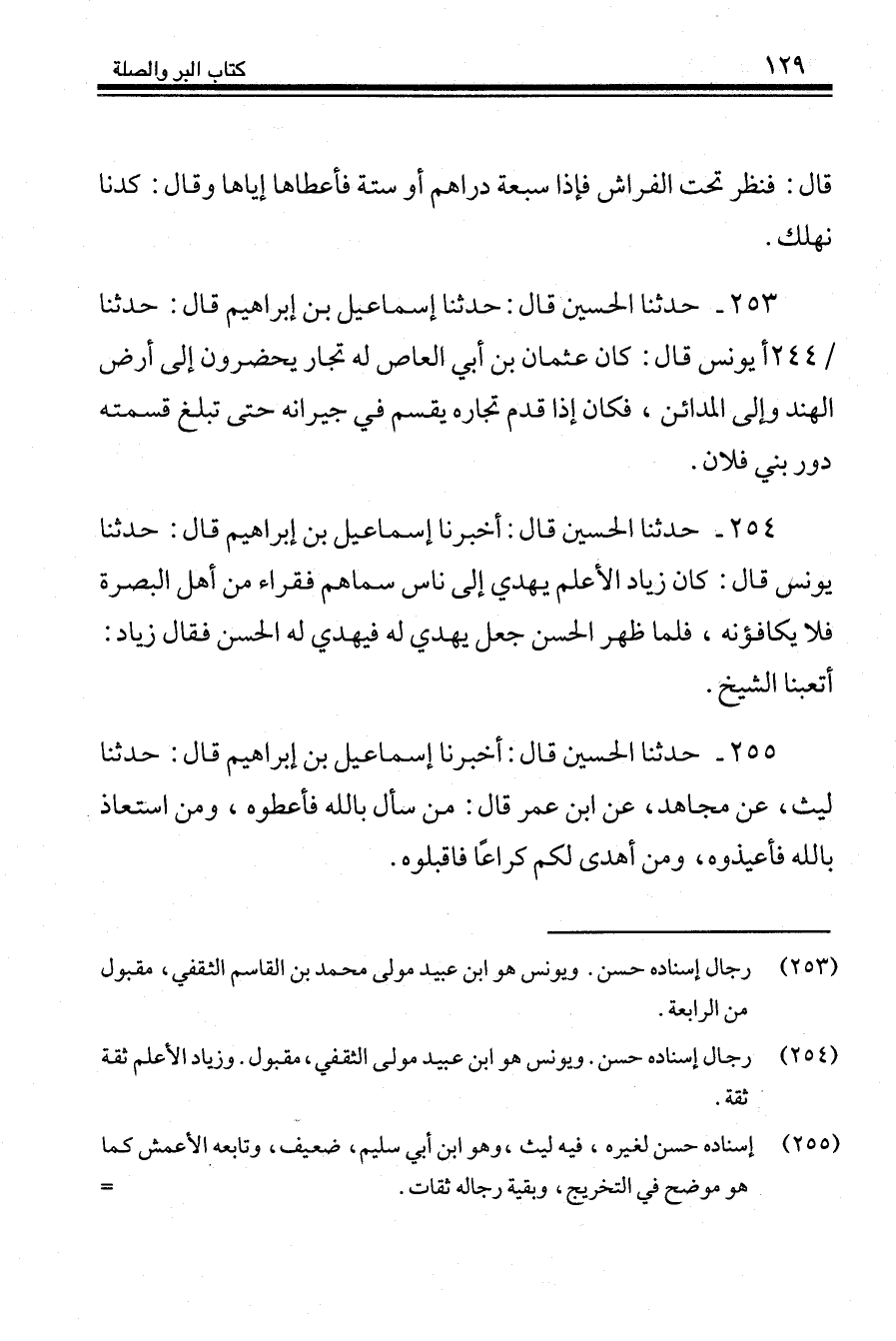 253 - حَدَّثَنَا الْحُسَيْنُ قَالَ: حَدَّثَنَا إِسْمَاعِيلُ بْنُ إِبْرَاهِيمَ، قَالَ: حَدَّثَنَا يُونُسُ، قَالَ: كَانَ عُثْمَانُ بْنُ أَبِي الْعَاصِ لَهُ تُجَّارٌ يَحْضُرُونَ إِلَى أَرْضِ الْهِنْدِ وَإِلَى الْمَدَائِنِ، فَكَانَ إِذَا قَدِمَ تُجَّارُهُ «§يَقْسِمُ فِي جِيرَانِهِ حَتَّى تَبْلُغَ قِسْمَتُهُ دُورَ بَنِي فُلَانٍ»