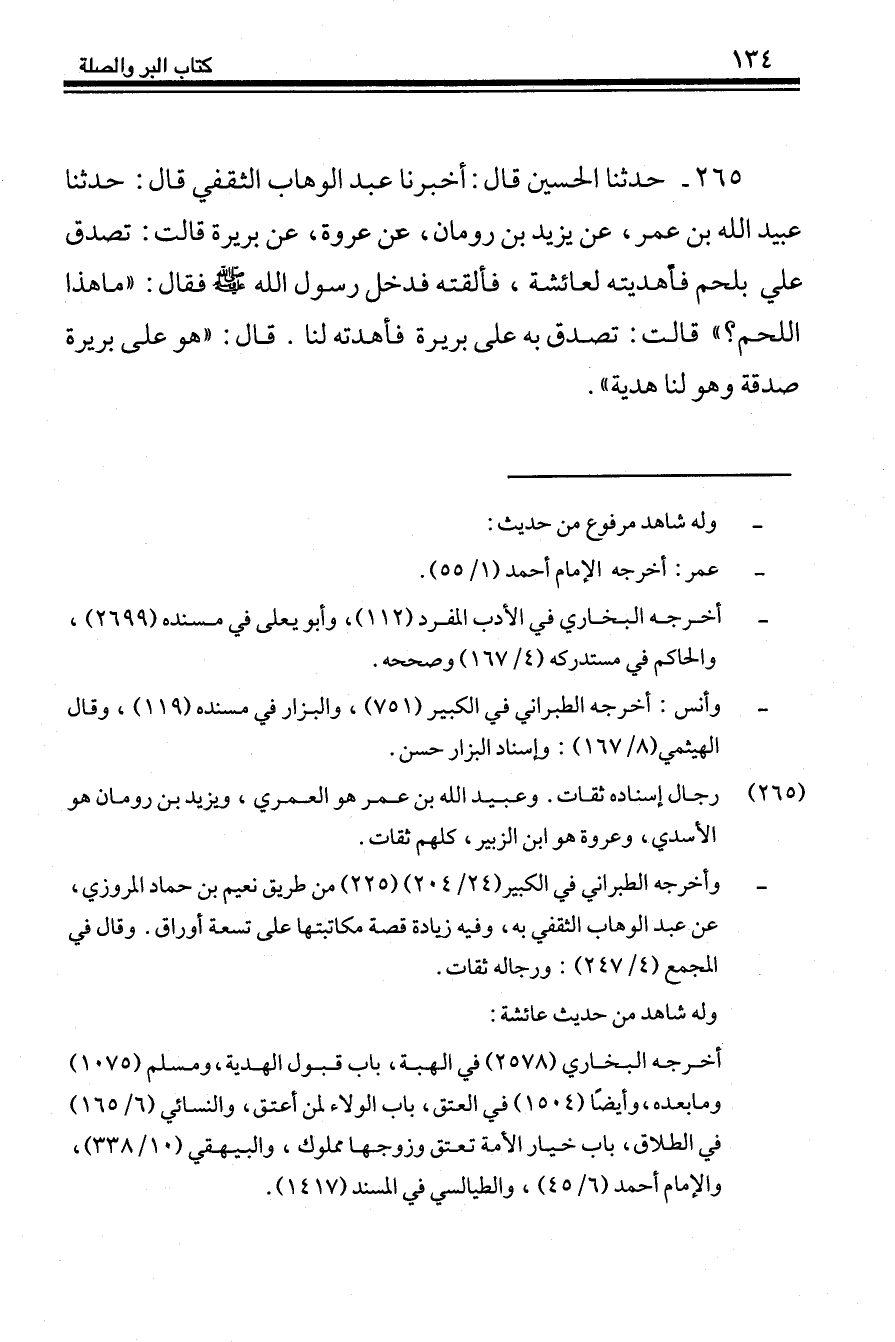 265 - حَدَّثَنَا الْحُسَيْنُ قَالَ: أَخْبَرَنَا عَبْدُ الْوَهَّابِ الثَّقَفِيُّ، قَالَ: حَدَّثَنَا عُبَيْدُ اللَّهِ بْنُ عُمَرَ، عَنْ يَزِيدَ بْنِ رُومَانَ، عَنْ عُرْوَةَ، عَنْ بَرِيرَةَ، قَالَتْ: تُصِدِّقَ عَلَيَّ بِلَحْمٍ، فَأَهْدَيْتُهُ لِعَائِشَةَ فَأَلْقَتْهُ، فَدَخَلَ رَسُولُ اللَّهِ صَلَّى اللهُ عَلَيْهِ وَسَلَّمَ فَقَالَ: «مَا هَذَا اللَّحْمُ؟» قَالَتْ: تُصُدِّقَ بِهِ عَلَى بَرِيرَةَ فَأَهْدَتْهُ لَنَا. قَالَ: «§هُوَ عَلَى بَرِيرَةَ صَدَقَةٌ وَهُوَ لَنَا هَدِيَّةٌ»