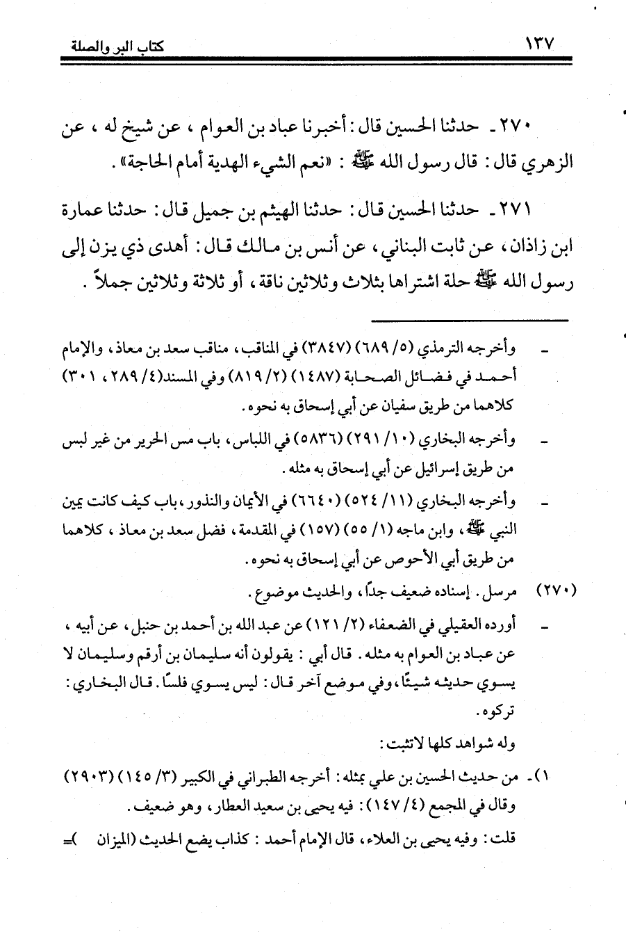 271 - حَدَّثَنَا الْحُسَيْنُ قَالَ: حَدَّثَنَا الْهَيْثَمُ بْنُ جَمِيلٍ، قَالَ: حَدَّثَنَا عُمَارَةُ بْنُ زَاذَانَ، عَنْ ثَابِتٍ الْبُنَانِيِّ، عَنْ أَنَسِ بْنِ مَالِكٍ، قَالَ: «§أَهْدَى ذِي يَزَنٍ إِلَى رَسُولِ اللَّهِ صَلَّى اللهُ عَلَيْهِ وَسَلَّمَ حُلَّةً اشْتَرَاهَا بِثَلَاثٍ وَثَلَاثِينَ نَاقَةً، أَوْ ثَلَاثَةٍ وَثَلَاثِينَ جَمَلًا»