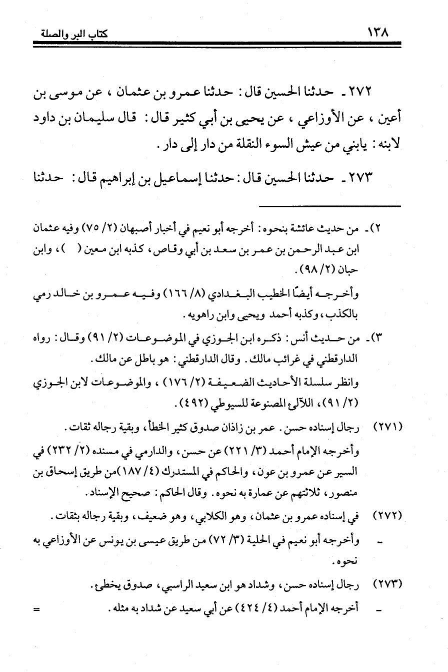 272 - حَدَّثَنَا الْحُسَيْنُ قَالَ: حَدَّثَنَا عَمْرُو بْنُ عُثْمَانَ، عَنْ مُوسَى بْنِ أَعْيَنَ، عَنِ الْأَوْزَاعِيِّ، عَنْ يَحْيَى بْنِ أَبِي كَثِيرٍ، قَالَ: " قَالَ سُلَيْمَانُ بْنُ دَاوُدَ لِابْنِهِ: يَا بُنَيَّ §مِنْ عَيْشِ السُّوءِ النَّقْلَةُ مِنْ دَارٍ إِلَى دَارٍ "