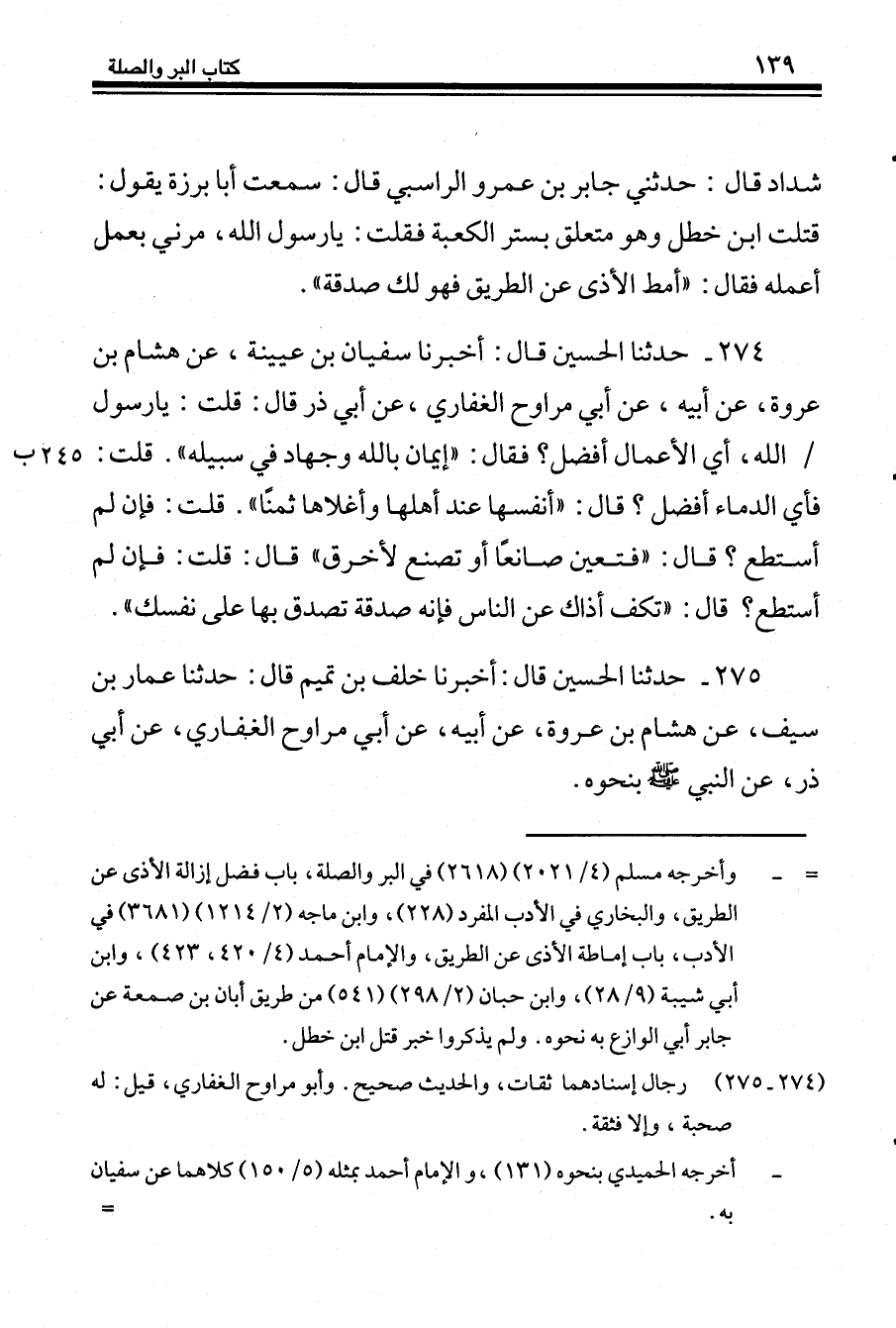 274 - حَدَّثَنَا الْحُسَيْنُ قَالَ: أَخْبَرَنَا سُفْيَانُ بْنُ عُيَيْنَةَ، عَنْ هِشَامِ بْنِ عُرْوَةَ، عَنْ أَبِيهِ، عَنْ أَبِي مُرَاوِحٍ الْغِفَارِيِّ، عَنْ أَبِي ذَرٍّ، قَالَ: قُلْتُ: يَا رَسُولَ اللَّهِ، أَيُّ الْأَعْمَالِ أَفْضَلُ؟ فَقَالَ: «§إِيمَانٌ بِاللَّهِ، وَجِهَادٌ فِي سَبِيلِهِ» ، قُلْتُ: فَأَيُّ الدِّمَاءِ أَفْضَلُ؟ قَالَ: «أَنْفَسُهَا عِنْدَ أَهْلِهَا وَأَغْلَاهَا ثَمَنًا» . قُلْتُ: فَإِنْ لَمْ أَسْتَطِعْ؟ قَالَ: «فَتُعِينُ صَانِعًا أَوْ تَصْنَعُ لِأَخْرَقَ» قَالَ: قُلْتُ: فَإِنْ لَمْ أَسْتَطِعْ؟ قَالَ: «تَكُفُّ أَذَاكَ عَنِ النَّاسِ فَإِنَّهُ صَدَقَةٌ تَصَدَّقْ بِهَا عَلَى نَفْسِكَ»