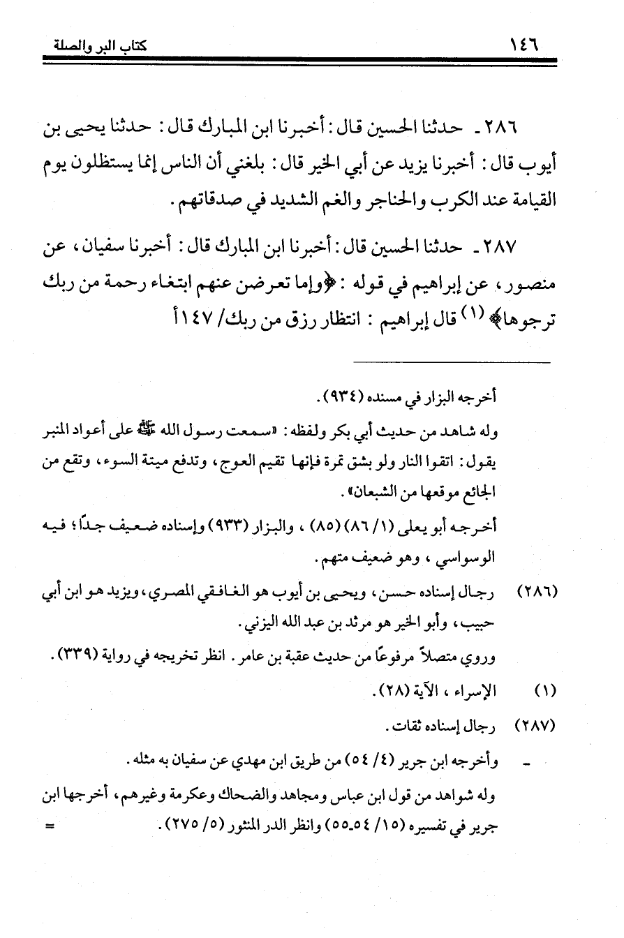 287 - حَدَّثَنَا الْحُسَيْنُ قَالَ: أَخْبَرَنَا ابْنُ الْمُبَارَكِ، قَالَ: أَخْبَرَنَا سُفْيَانُ، عَنْ مَنْصُورٍ، عَنْ إِبْرَاهِيمَ فِي قَوْلِهِ: {§وَإِمَّا تُعْرِضَنَّ عَنْهُمُ ابْتِغَاءَ رَحْمَةٍ مِنْ رَبِّكَ تَرْجُوهَا} [الإسراء: 28] قَالَ إِبْرَاهِيمُ: «انْتِظَارُ رِزْقٍ مِنْ رَبِّكَ»