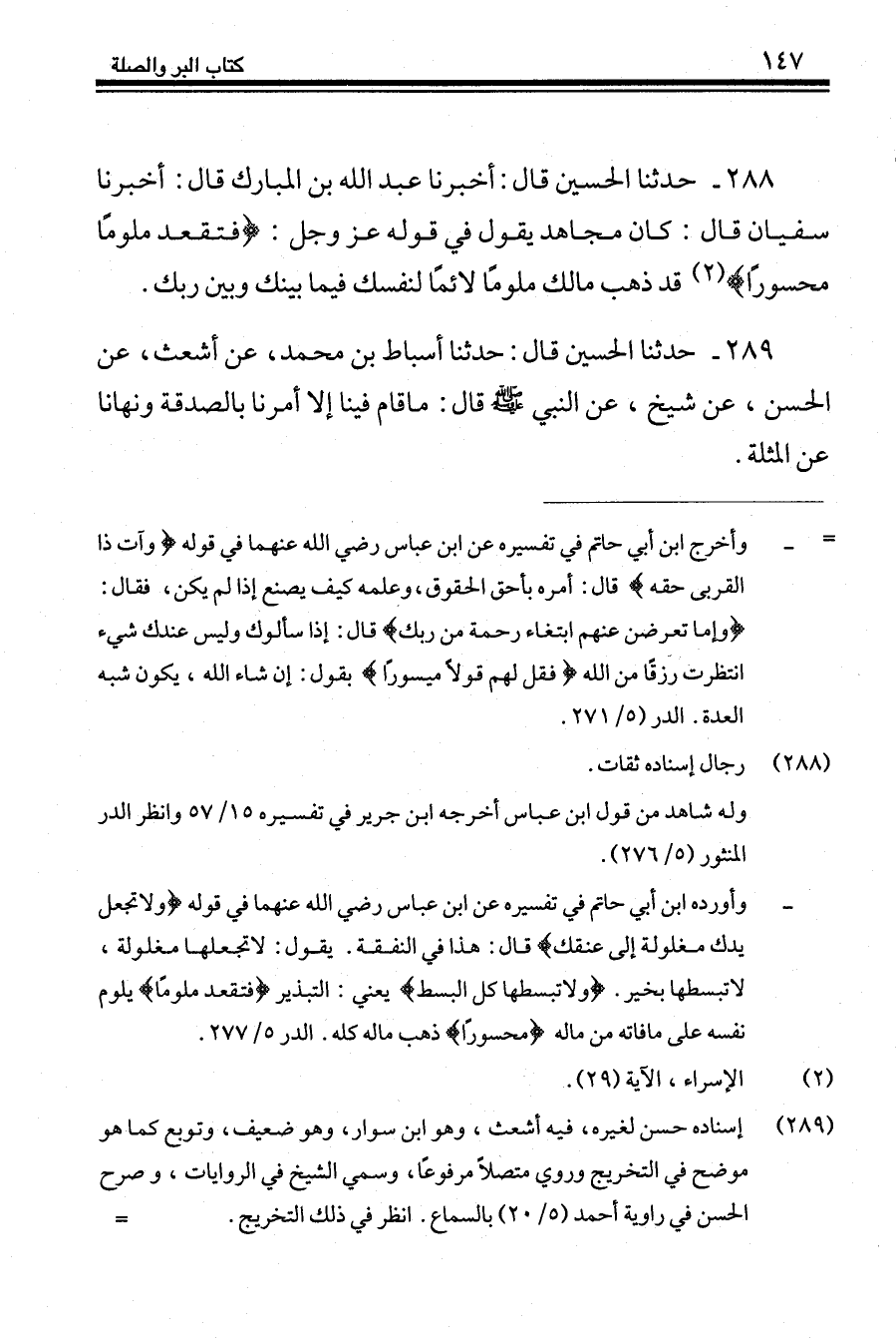 288 - حَدَّثَنَا الْحُسَيْنُ قَالَ: أَخْبَرَنَا عَبْدُ اللَّهِ بْنُ الْمُبَارَكِ، قَالَ: أَخْبَرَنَا سُفْيَانُ، قَالَ: كَانَ مُجَاهِدٌ يَقُولُ فِي قَوْلِهِ عَزَّ وَجَلَّ: {§فَتَقْعُدَ مَلُومًا مَحْسُورًا} [الإسراء: 29] «قَدْ ذَهَبَ مَالُكٌ مَلُومًا لَائِمًا لِنَفْسِكَ فِيمَا بَيْنَكَ وَبَيْنَ رَبِّكَ»