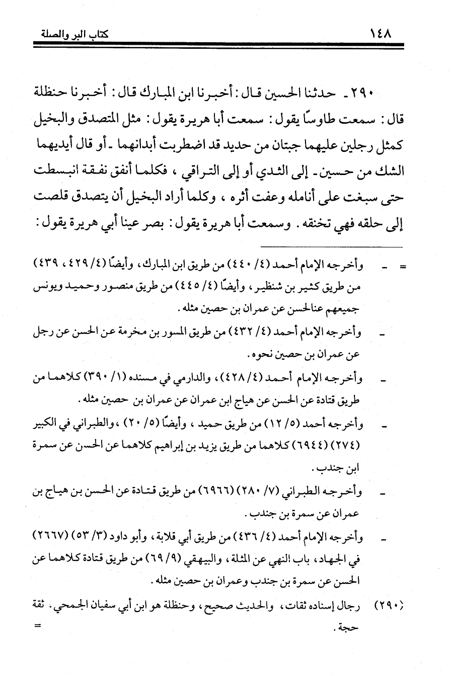 290 - حَدَّثَنَا الْحُسَيْنُ قَالَ: أَخْبَرَنَا ابْنُ الْمُبَارَكِ، قَالَ: أَخْبَرَنَا حَنْظَلَةُ، قَالَ: سَمِعْتُ طَاوُسًا، يَقُولُ: سَمِعْتُ أَبَا هُرَيْرَةَ، يَقُولُ: مَثَلُ الْمُتَصَدِّقِ وَالْبَخِيلِ كَمَثَلِ رَجُلَيْنِ عَلَيْهِمَا جُبَّتَانِ مِنْ حَدِيدٍ، قَدِ اضْطَرَبَتْ أَبْدَانُهُمَا - أَوْ قَالَ: أَيْدِيُهُمَا - الشَّكُّ مِنْ حُسَيْنٍ - إِلَى الثَّدْيِ أَوْ إِلَى التَّرَاقِي، فَكُلَّمَا أَنْفَقَ نَفَقَةً انْبَسَطَتْ حَتَّى سَبَغَتْ عَلَى أَنَامِلِهِ، وَعَفَتْ أَثَرَهُ، وَكُلَّمَا أَرَادَ الْبَخِيلُ أَنْ يَتَصَدَّقَ قَلَصَتْ إِلَى حَلْقِهِ فَهِيَ تَخْنُقُهُ. وَسَمِعْتُ أَبَا هُرَيْرَةَ يَقُولُ: بَصُرَ عَيْنَا أَبِي هُرَيْرَةَ يَقُولُ -[149]-: رَأَيْتُ رَسُولَ اللَّهِ صَلَّى اللهُ عَلَيْهِ وَسَلَّمَ وَاضِعًا أُصْبُعَيْهِ عِنْدَ حَلْقِهِ وَهُوَ يَقُولُ: «§فَهِيَ تَخْنُقُهُ وَيَرْخِيهَا وَلَا تَتَرَاخَى»