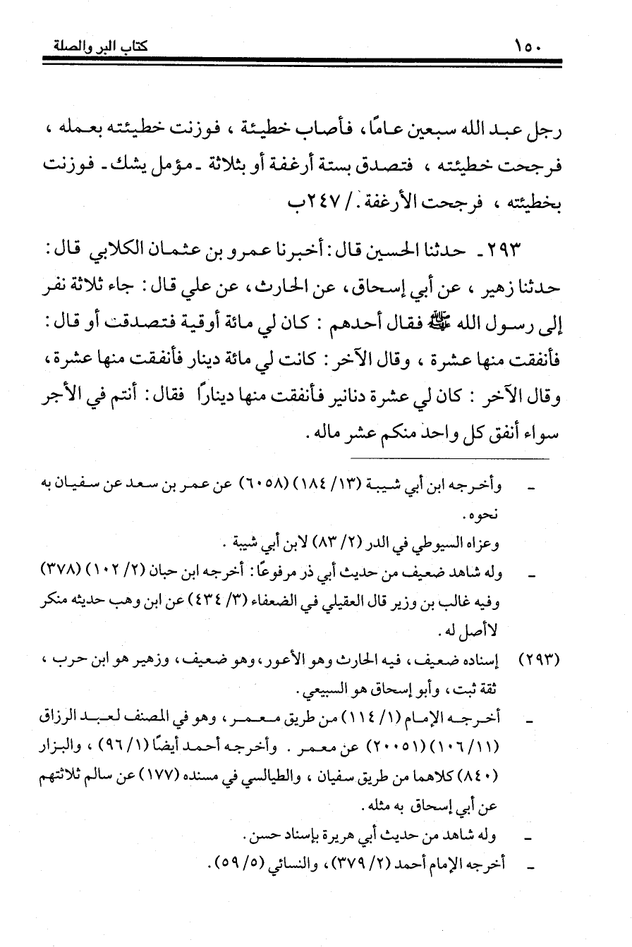 293 - حَدَّثَنَا الْحُسَيْنُ قَالَ: أَخْبَرَنَا عَمْرُو بْنُ عُثْمَانَ الْكِلَابِيُّ، قَالَ: حَدَّثَنَا زُهَيْرٌ، عَنْ أَبِي إِسْحَاقَ، عَنِ الْحَارِثِ، عَنْ عَلِيٍّ، قَالَ: جَاءَ ثَلَاثَةُ نَفَرٍ إِلَى رَسُولِ اللَّهِ صَلَّى اللهُ عَلَيْهِ وَسَلَّمَ، فَقَالَ أَحَدُهُمْ: كَانَ لِي مِائَةُ أُوقِيَّةٍ فَتَصَدَّقْتُ، أَوْ قَالَ: فَأَنْفَقْتُ مِنْهَا عَشْرَةً، وَقَالَ الْآخَرُ: كَانَتْ لِي مِائَةُ دِينَارٍ فَأَنْفَقْتُ مِنْهَا عَشْرَةً، وَقَالَ الْآخَرُ: كَانَتْ لِي عَشْرَةُ دَنَانِيرَ فَأَنْفَقْتُ مِنْهَا دِينَارًا فَقَالَ: «§أَنْتُمْ فِي الْأَجْرِ سَوَاءٌ، أَنْفَقَ كُلُّ وَاحِدٍ مِنْكُمْ عُشْرَ مَالِهِ»