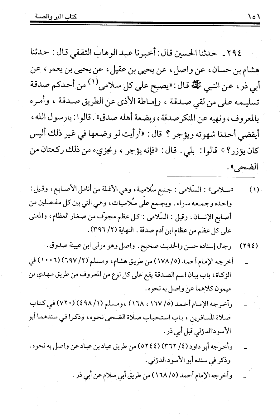 294 - حَدَّثَنَا الْحُسَيْنُ قَالَ: أَخْبَرَنَا عَبْدُ الْوَهَّابِ الثَّقَفِيُّ، قَالَ: حَدَّثَنَا هِشَامُ بْنُ حَسَّانَ، عَنْ وَاصِلٍ، عَنْ يَحْيَى بْنِ عَقِيلٍ، عَنْ يَحْيَى بْنِ يَعْمَرَ، عَنْ أَبِي ذَرٍّ، عَنِ النَّبِيِّ صَلَّى اللهُ عَلَيْهِ وَسَلَّمَ قَالَ: " §يُصْبِحُ عَلَى كُلِّ سُلَامَى مِنْ أَحَدِكُمْ صَدَقَةٌ: تَسْلِيمُهُ عَلَى مَنْ لَقِيَ صَدَقَةٌ. وَإِمَاطَةُ الْأَذَى عَنِ الطَّرِيقِ صَدَقَةً وَأَمْرُهُ بِالْمَعْرُوفِ، وَنَهْيُهُ عَنِ الْمُنْكَرِ صَدَقَةٌ وَبُضْعَةُ أَهْلِهِ صَدَقَةٌ " قَالُوا: يَا رَسُولَ اللَّهِ، أَيَقْضِي أَحَدُنَا شَهْوَتَهُ وَيُؤْجَرُ؟ قَالَ: «أَرَأَيْتَ لَوْ وَضَعَهَا فِي غَيْرِ ذَلِكَ أَلَيْسَ كَانَ يُؤْزَرُ؟» قَالُوا: بَلَى قَالَ: «فَإِنَّهُ يُؤْجَرُ وَتُجْزِئُ مِنْ ذَلِكَ رَكْعَتَانِ مِنَ الضُّحَى»