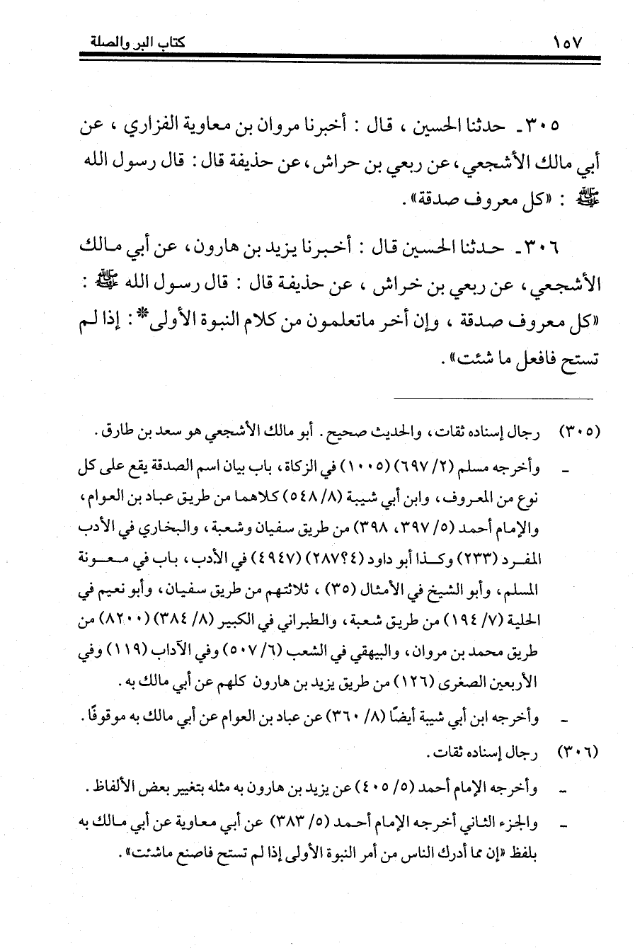 305 - حَدَّثَنَا الْحُسَيْنُ قَالَ: أَخْبَرَنَا مَرْوَانُ بْنُ مُعَاوِيَةَ الْفَزَارِيُّ، عَنْ أَبِي مَالِكٍ الْأَشْجَعِيِّ، عَنْ رِبْعِيِّ بْنِ حِرَاشٍ، عَنْ حُذَيْفَةَ، قَالَ: قَالَ رَسُولُ اللَّهِ صَلَّى اللهُ عَلَيْهِ وَسَلَّمَ: «§كُلُّ مَعْرُوفٍ صَدَقَةٌ»
