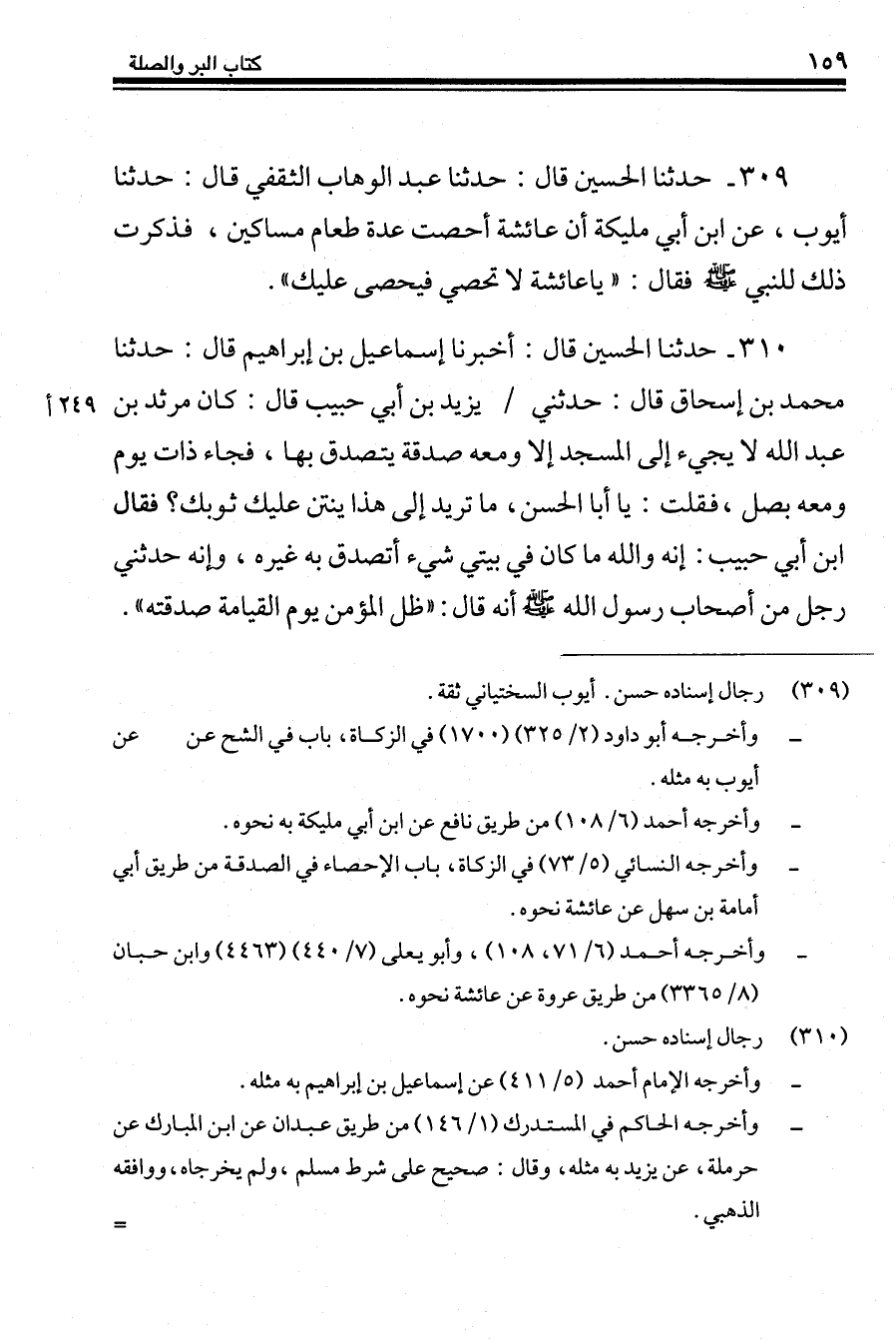 309 - حَدَّثَنَا الْحُسَيْنُ قَالَ: حَدَّثَنَا عَبْدُ الْوَهَّابِ الثَّقَفِيُّ، قَالَ: حَدَّثَنَا أَيُّوبُ، عَنِ ابْنِ أَبِي مُلَيْكَةَ، أَنَّ عَائِشَةَ، أَحْصَتْ عِدَّةَ طَعَامِ مَسَاكِينَ، فَذَكَرَتْ ذَلِكَ لِلنَّبِيِّ صَلَّى اللهُ عَلَيْهِ وَسَلَّمَ فَقَالَ: «يَا عَائِشَةُ §لَا تُحْصِي فَيُحْصَى عَلَيْكِ»