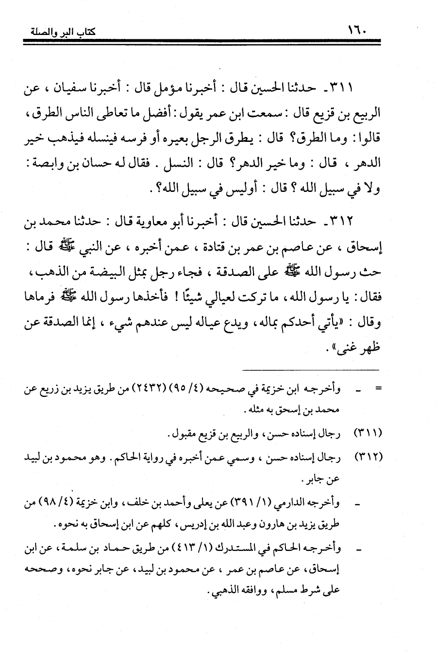 312 - حَدَّثَنَا الْحُسَيْنُ قَالَ: أَخْبَرَنَا أَبُو مَعَاويَةَ، قَالَ: حَدَّثَنَا مُحَمَّدُ بْنُ إِسْحَاقَ، عَنْ عَاصِمِ بْنِ عُمَرَ بْنِ قَتَادَةَ، عَمَّنْ أَخْبَرَهُ عَنِ النَّبِيِّ صَلَّى اللهُ عَلَيْهِ وَسَلَّمَ قَالَ: حَثَّ رَسُولُ اللَّهِ صَلَّى اللهُ عَلَيْهِ وَسَلَّمَ عَلَى الصَّدَقَةِ، فَجَاءَ رَجُلٌ بِمِثْلِ الْبَيْضَةِ مِنَ الذَّهَبِ فَقَالَ: يَا رَسُولَ اللَّهِ، مَا تَرَكْتُ لِعِيَالِي شَيْئًا فَأَخَذَهَا رَسُولُ اللَّهِ صَلَّى اللهُ عَلَيْهِ وَسَلَّمَ فَرَمَاهَا، وَقَالَ: «يَأْتِي أَحَدُكُمْ بِمَالِهِ وَيَدَعُ عِيَالَهُ لَيْسَ عِنْدَهُمْ شَيْءٌ، إِنَّمَا §الصَّدَقَةُ عَنْ ظَهْرِ غِنًى»