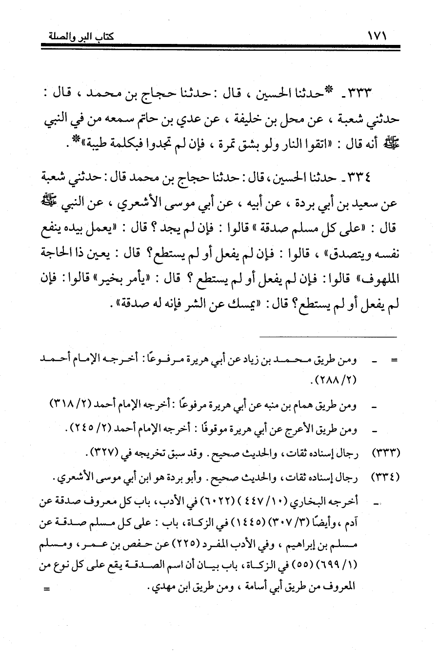 333 - حَدَّثَنَا الْحُسَيْنُ قَالَ: حَدَّثَنَا حَجَّاجُ بْنُ مُحَمَّدٍ، قَالَ: حَدَّثَنِي شُعْبَةُ، عَنْ مُحِلِّ بْنِ خَلِيفَةَ، عَنْ عَدِيِّ بْنِ حَاتِمٍ، سَمِعَهُ مِنْ فِي النَّبِيِّ صَلَّى اللهُ عَلَيْهِ وَسَلَّمَ أَنَّهُ قَالَ: «§اتَّقُوا النَّارَ وَلوْ بِشِقِّ تَمْرَةٍ، فَإِنْ لَمْ تَجِدُوا فَبِكَلِمَةٍ طَيِّبَةٍ»