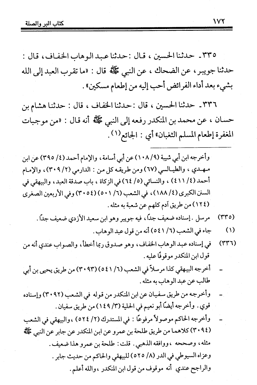 335 - حَدَّثَنَا الْحُسَيْنُ قَالَ: حَدَّثَنَا عَبْدُ الْوَهَّابِ الْخَفَّافُ، قَالَ: حَدَّثَنَا جُوَيْبِرٌ، عَنِ الضَّحَّاكِ، عَنِ النَّبِيِّ صَلَّى اللهُ عَلَيْهِ وَسَلَّمَ قَالَ: «§مَا تَقَرَّبَ الْعَبْدُ إِلَى اللَّهِ بِشَيْءٍ بَعْدَ أَدَاءِ الْفَرَائِضِ أَحَبُّ إِلَيْهِ مِنْ إِطْعَامِ مِسْكِينٍ»