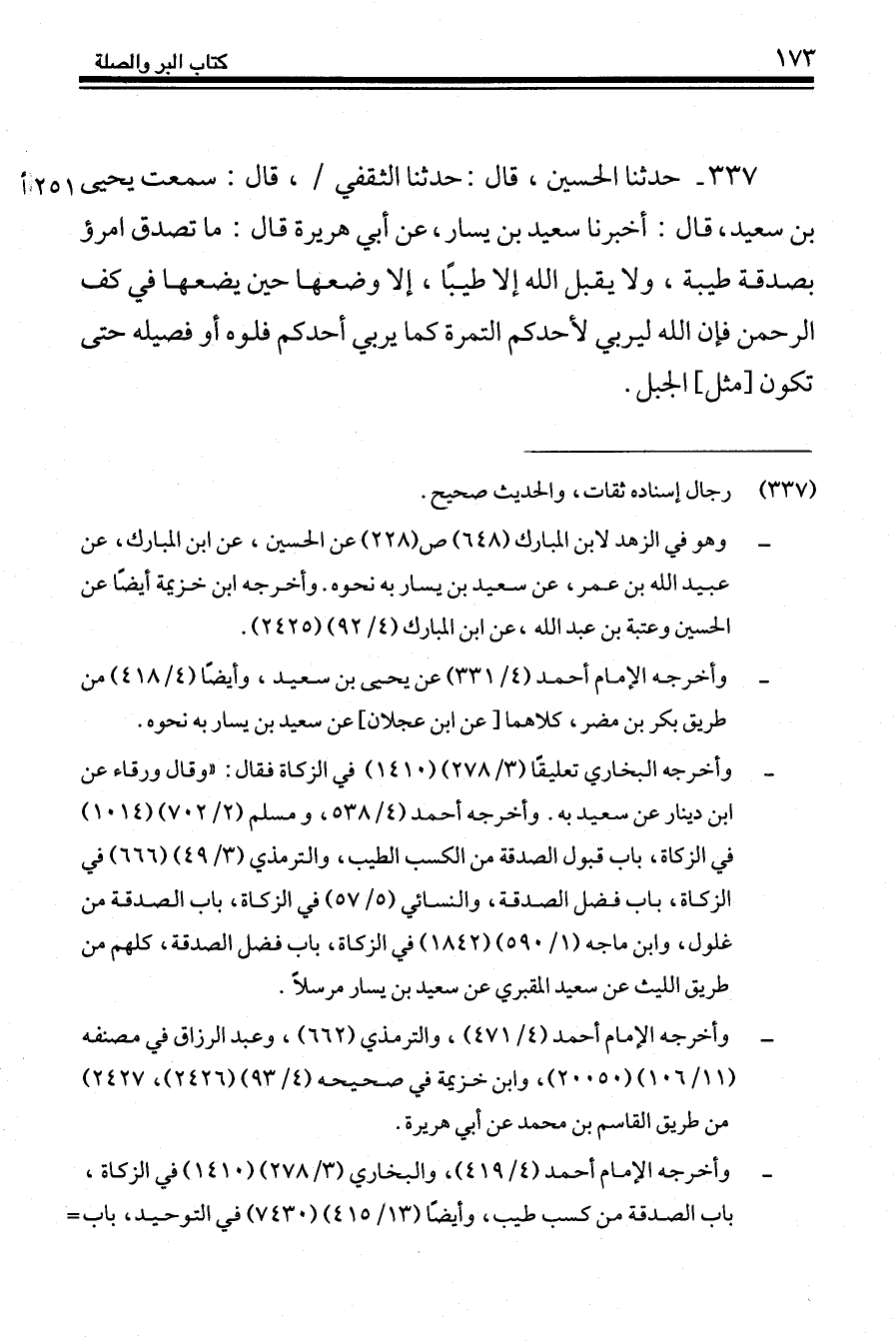 337 - حَدَّثَنَا الْحُسَيْنُ قَالَ: حَدَّثَنَا الثَّقَفِيُّ، قَالَ: سَمِعْتُ يَحْيَى بْنَ سَعِيدٍ، قَالَ: أَخْبَرَنَا سَعِيدُ بْنُ يَسَارٍ، عَنْ أَبِي هُرَيْرَةَ، قَالَ: «§مَا تَصَدَّقَ امْرُؤٌ بِصَدَقَةٍ طَيْبَةٍ، وَلَا يَقْبَلُ اللَّهُ إِلَّا طَيِّبًا، إِلَّا وَضَعَهَا حِينَ يَضَعُهَا فِي كَفِّ الرَّحْمَنِ، فَإِنَّ اللَّهَ لَيُرْبِي لِأَحَدِكُمُ التَّمْرَةَ كَمَا يُرْبِي أَحَدُكُمْ فَلُوَّهُ أَوْ فَصِيلَهُ حَتَّى تَكُونَ مِثْلَ الْجَبَلُ»