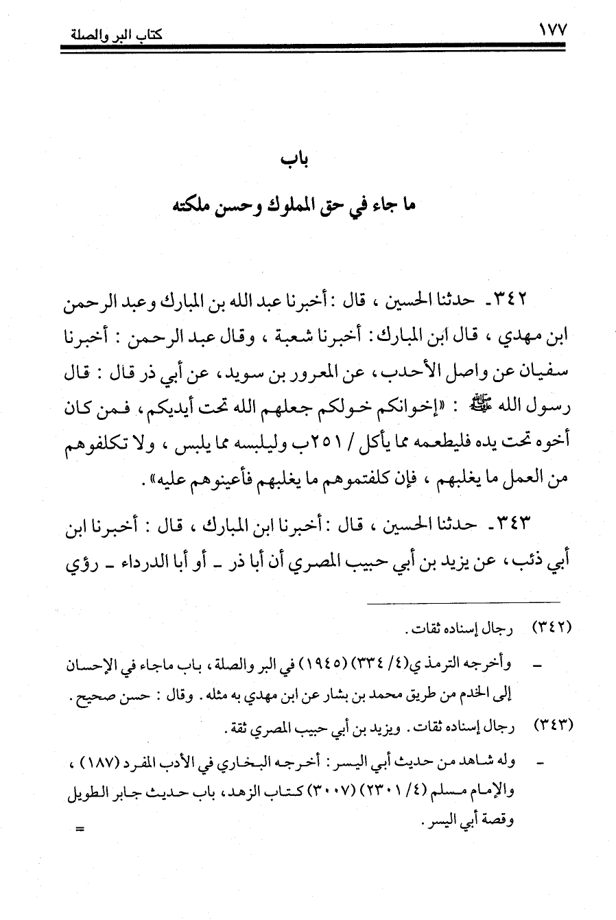 342 - حَدَّثَنَا الْحُسَيْنُ قَالَ: أَخْبَرَنَا عَبْدُ اللَّهِ بْنُ الْمُبَارَكِ، وَعَبْدُ الرَّحْمَنِ بْنُ مَهْدِيٍّ، قَالَ ابْنُ الْمُبَارَكِ: أَخْبَرَنَا شُعْبَةُ، وَقَالَ عَبْدُ الرَّحْمَنِ: أَخْبَرَنَا سُفْيَانُ، عَنْ وَاصِلٍ الْأَحْدَبِ، عَنِ الْمَعْرُورِ بْنِ سُوَيْدٍ، عَنْ أَبِي ذَرٍّ، قَالَ: قَالَ رَسُولُ اللَّهِ صَلَّى اللهُ عَلَيْهِ وَسَلَّمَ: «§إِخْوَانُكُمْ خَوَلُكُمْ جَعَلَهُمُ اللَّهُ تَحْتَ أَيْدِيكُمْ فَمَنْ كَانَ أَخُوهُ تَحْتَ يَدِهِ فَلْيُطْعِمْهُ مِمَّا يَأْكُلُ، وَلْيُلْبِسْهُ مِمَّا يَلْبَسُ، وَلَا تُكَلِّفُوهُمْ مِنَ الْعَمَلِ مَا يَغْلِبُهُمْ، فَإِنْ كَلَّفْتُمُوهُمْ مَا يَغْلِبُهُمْ فَأَعِينُوهُمْ عَلَيْهِ»