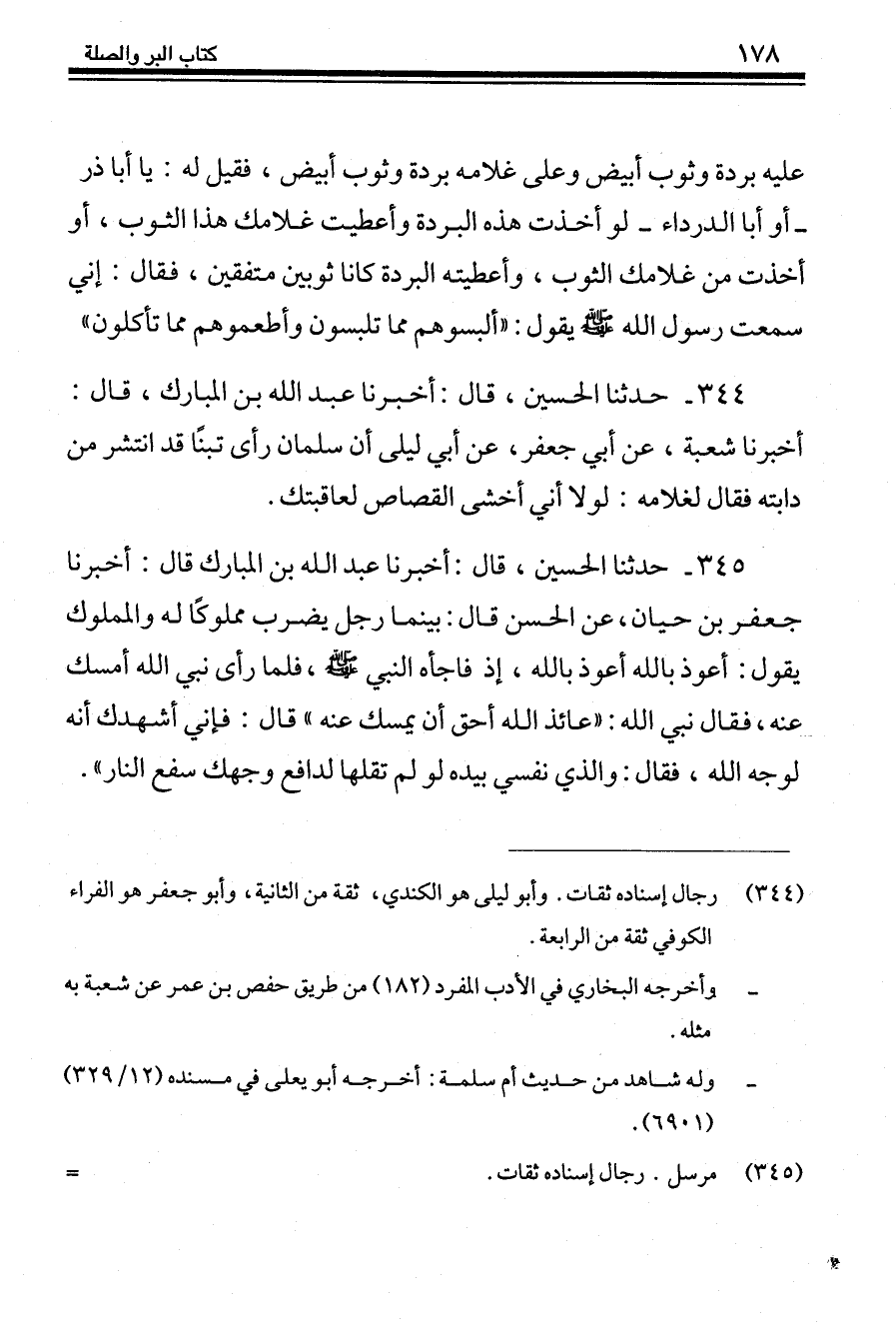 345 - حَدَّثَنَا الْحُسَيْنُ قَالَ: أَخْبَرَنَا عَبْدُ اللَّهِ بْنُ الْمُبَارَكِ، قَالَ: أَخْبَرَنَا جَعْفَرُ بْنُ حَيَّانَ، عَنِ الْحَسَنِ، قَالَ: بَيْنَمَا رَجُلٌ يَضْرِبُ مَمْلُوكًا لَهُ وَالْمَمْلُوكُ يَقُولُ: أَعُوذُ بِاللَّهِ أَعُوذُ بِاللَّهِ، إِذْ فَاجَأَهُ النَّبِيُّ صَلَّى اللهُ عَلَيْهِ وَسَلَّمَ فَلَمَّا رَأَى نَبِيَّ اللَّهِ أَمْسَكَ عَنْهُ، فَقَالَ نَبِيُّ اللَّهِ: «§عَائِذُ اللَّهِ أَحَقُّ أَنْ يُمْسَكَ عَنْهُ» قَالَ: فَإِنِّي أُشْهِدُكَ أَنَّهُ لِوَجْهِ اللَّهِ، فَقَالَ: «وَالَّذِي نَفْسِي بِيَدِهِ لَوْ لَمْ تَقُلْهَا لَدَافَعَ وَجْهُكَ سَفْعَ النَّارِ»
