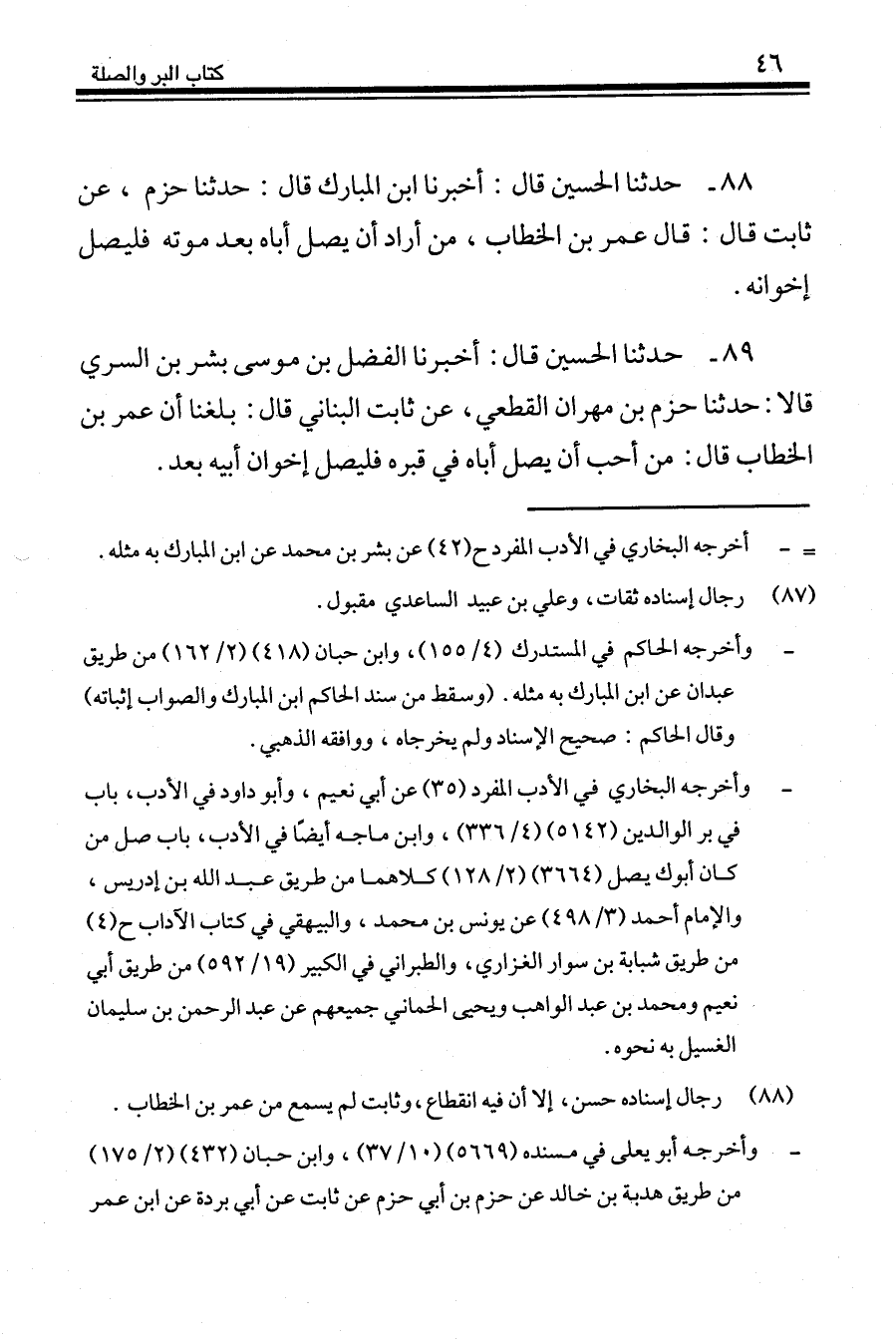 88 - حَدَّثَنَا الْحُسَيْنُ قَالَ: أَخْبَرَنَا ابْنُ الْمُبَارَكِ، قَالَ: حَدَّثَنَا حَزْمٌ، عَنْ ثَابِتٍ، قَالَ: قَالَ عُمَرُ بْنُ الْخَطَّابِ: «§مَنْ أَرَادَ أَنْ يَصِلَ أَبَاهُ بَعْدَ مَوْتِهِ فَلْيَصِلْ إِخْوَانَهُ»
