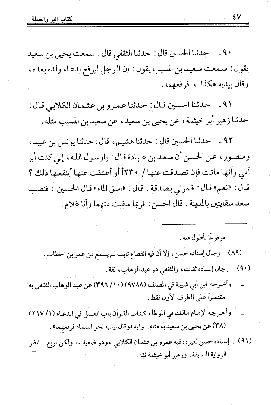90 - حَدَّثَنَا الْحُسَيْنُ قَالَ: حَدَّثَنَا الثَّقَفِيُّ، قَالَ: سَمِعْتُ يَحْيَى بْنَ سَعِيدٍ، يَقُولُ: سَمِعْتُ سَعِيدَ بْنَ الْمُسَيِّبِ، يَقُولُ: «إِنَّ §الرَّجُلَ لَيُرْفَعُ بِدُعَاءِ وَلَدِهِ بَعْدَهُ» وَقَالَ: بِيَدَيْهِ هَكَذَا، فَرفَعَهُمَا