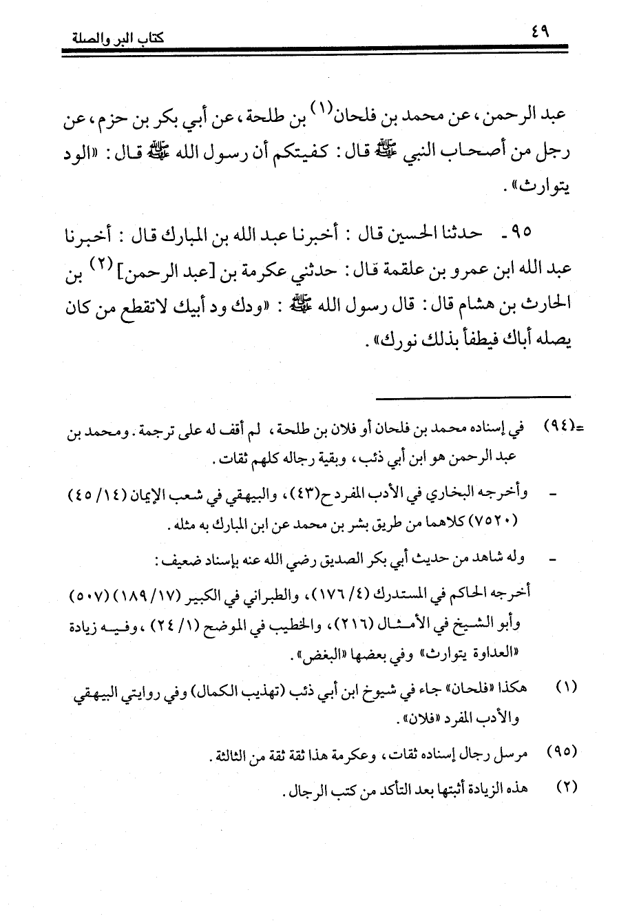 95 - حَدَّثَنَا الْحُسَيْنُ قَالَ: أَخْبَرَنَا عَبْدُ اللهِ بْنُ الْمُبَارَكِ، قَالَ: أَخْبَرَنَا عَبْدُ اللَّهِ بْنُ عَمْرِو بْنِ عَلْقَمَةَ، قَالَ: حَدَّثَنِي عِكْرِمَةُ بْنُ عَبْدِ الرَّحْمَنِ بْنِ الْحَارِثِ بْنِ هِشَامٍ، قَالَ: قَالَ رَسُولُ اللَّهِ صَلَّى اللهُ عَلَيْهِ وَسَلَّمَ: «§وُدُّكَ وُدُّ أَبِيكَ، لَا تَقْطَعْ مَنْ كَانَ يَصِلُهُ أَبُوكَ فَيُطْفَأَ بِذَلِكَ نُورُكَ»