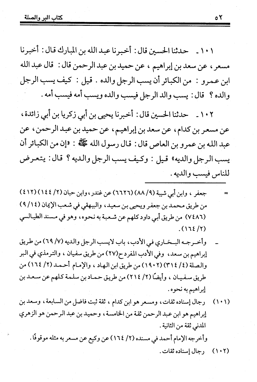 102 - حَدَّثَنَا الْحُسَيْنُ قَالَ: أَخْبَرَنَا يَحْيَى بْنُ أَبِي زَكَرِيَّا بْنِ أَبِي زَائِدَةَ، عَنْ مِسْعَرِ بْنِ كِدَامٍ، عَنْ سَعْدِ بْنِ إِبْرَاهِيمَ، عَنْ حُمَيْدِ بْنِ عَبْدِ الرَّحْمَنِ، عَنْ عَبْدِ اللَّهِ بْنِ عَمْرِو بْنِ الْعَاصِ، قَالَ: قَالَ رَسُولُ اللَّهِ صَلَّى اللهُ عَلَيْهِ وَسَلَّمَ: «إِنَّ §مِنَ الْكَبَائِرِ أَنْ يَسُبَّ الرَّجُلُ وَالِدَيْهِ» قِيلَ: وَكَيْفَ يَسُبُّ الرَّجُلُ وَالِدَيْهِ؟ قَالَ: «يَتَعَرَّضُ لِلنَّاسِ فَيَسُبُّ وَالِدَيْهِ»