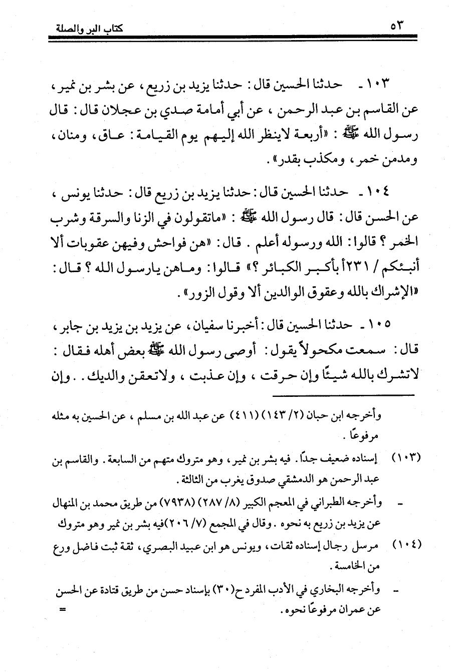 104 - حَدَّثَنَا الْحُسَيْنُ قَالَ: حَدَّثَنَا يَزِيدُ بْنُ زُرَيْعٍ، قَالَ حَدَّثَنَا يُونُسُ، عَنِ الْحَسَنِ، قَالَ: قَالَ رَسُولُ اللَّهِ صَلَّى اللهُ عَلَيْهِ وَسَلَّمَ: «مَا تَقُولُونَ فِي الزِّنَا وَالسَّرِقَةِ وَشُرْبِ الْخَمْرِ؟» قَالُوا: اللَّهُ وَرَسُولُهُ أَعْلَمُ. قَالَ: «هُنَّ فَوَاحِشُ، وَفِيهِنَّ عُقُوبَاتٌ، أَلَا أُنَبِّئُكُمْ بِأَكْبَرِ الْكَبَائِرِ؟» قَالُوا: وَمَا هُنَّ يَا رَسُولَ اللَّهِ؟ قَالَ: «§الْإِشْرَاكُ بِاللَّهِ، وَعُقُوقُ الْوَالِدَيْنِ، أَلَا وَقَوْلُ الزُّورِ»