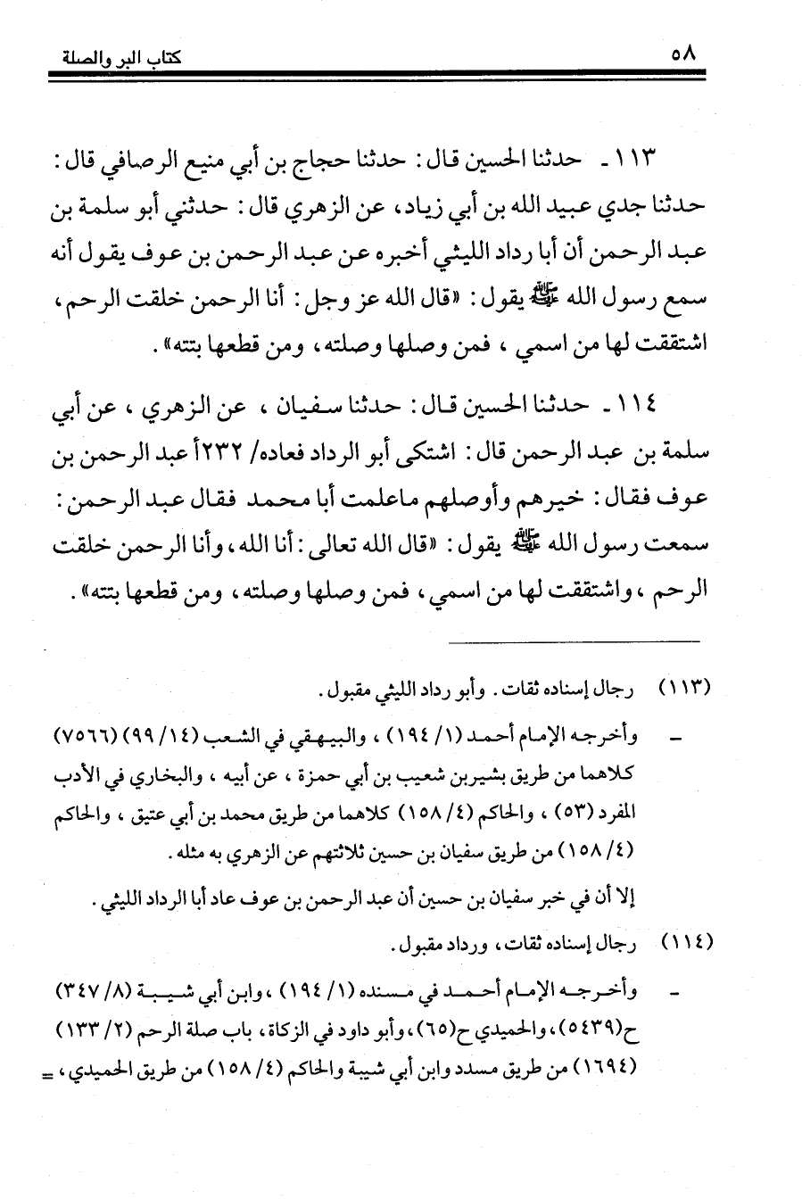 113 - حَدَّثَنَا الْحُسَيْنُ قَالَ: حَدَّثَنَا حَجَّاجُ بْنُ أَبِي مَنِيعٍ الرُّصَافِيُّ، قَالَ: حَدَّثَنَا جَدِّي عُبَيْدُ اللَّهِ بْنُ أَبِي زِيَادٍ، عَنِ الزُّهْرِيِّ، قَالَ: حَدَّثَنِي أَبُو سَلَمَةَ بْنُ عَبْدِ الرَّحْمَنِ، أَنَّ أَبَا رَدَّادٍ اللَّيْثِيَّ أَخْبَرَهُ , عَنْ عَبْدِ الرَّحْمَنِ بْنِ عَوْفٍ، يَقُولُ: أَنَّهُ سَمِعَ رَسُولَ اللَّهِ صَلَّى اللهُ عَلَيْهِ وَسَلَّمَ يَقُولُ: " قَالَ اللَّهُ عَزَّ وَجَلَّ: «§أَنَا الرَّحْمَنُ خَلَقْتُ الرَّحِمَ وَاشْتَقَقْتُ لَهَا مِنِ اسْمِي، فَمَنْ وَصَلَهَا وَصَلْتُهُ وَمِنْ قَطَعَهَا بَتَتُّهُ»