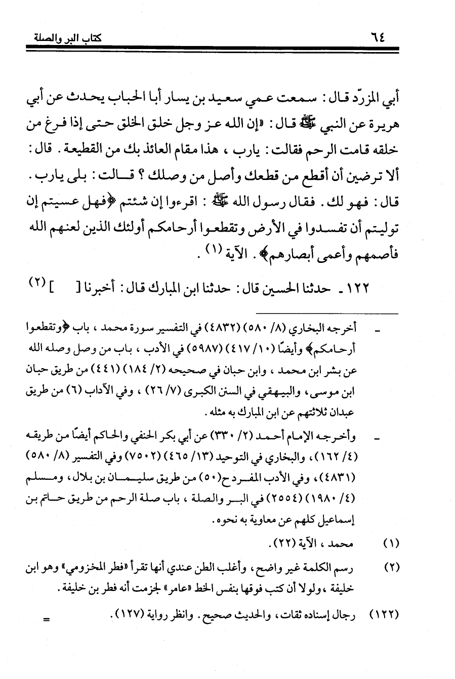 122 - حَدَّثَنَا الْحُسَيْنُ قَالَ: حَدَّثَنَا ابْنُ الْمُبَارَكِ، قَالَ: أَخْبَرَنَا فِطْرُ بْنُ خَلِيفَةَ -[65]- عَنْ مُجَاهِدٍ، قَالَ: سَمِعْتُ عَبْدَ اللَّهِ بْنَ عَمْرِو بْنِ الْعَاصِ، يَقُولُ: قَالَ رَسُولُ اللَّهِ صَلَّى اللهُ عَلَيْهِ وَسَلَّمَ: «§الرَّحِمُ مُعَلَّقَةٌ بِالْعَرْشِ، وَلَيْسَ الْوَاصِلُ بِالْمُكَافِئِ، وَلَكِنَّ الْوَاصِلَ مَنْ إِذَا انْقَطَعَتْ رَحِمُهُ وَصَلَهَا»