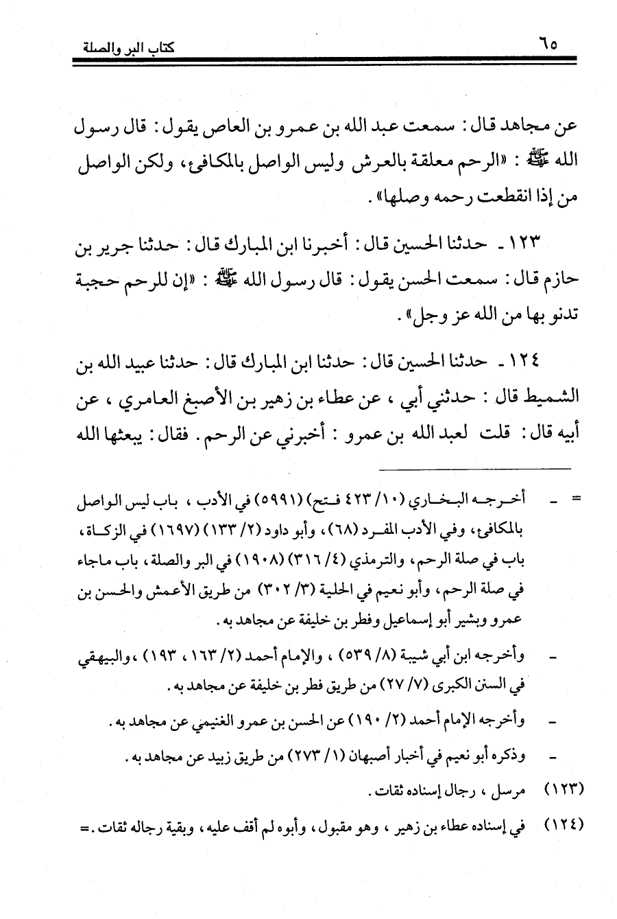 123 - حَدَّثَنَا الْحُسَيْنُ قَالَ: أَخْبَرَنَا ابْنُ الْمُبَارَكِ، قَالَ: حَدَّثَنَا جَرِيرُ بْنُ حَازِمٍ، قَالَ: سَمِعْتُ الْحَسَنَ، يَقُولُ: قَالَ رَسُولُ اللَّهِ صَلَّى اللهُ عَلَيْهِ وَسَلَّمَ: «إِنَّ §لِلرَّحِمِ حَجَبَةٌ تَدْنُو بِهَا مِنَ اللَّهِ عَزَّ وَجَلَّ»