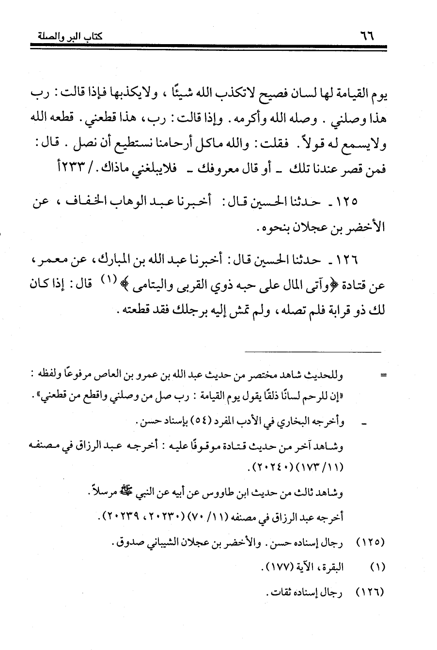 126 - حَدَّثَنَا الْحُسَيْنُ قَالَ: أَخْبَرَنَا عَبْدُ اللَّهِ بْنُ الْمُبَارَكِ، عَنْ مَعْمَرٍ، عَنْ قَتَادَةَ: {§وَآتَى الْمَالَ عَلَى حُبِّهِ ذَوِي الْقُرْبَى وَالْيَتَامَى} [البقرة: 177] قَالَ: إِذَا كَانَ لَكَ ذُو قَرَابَةٍ فَلَمْ تَصِلْهُ، وَلَمْ تَمْشِ إِلَيْهِ بِرِجْلِكَ فَقَدْ قَطَعْتَهُ "