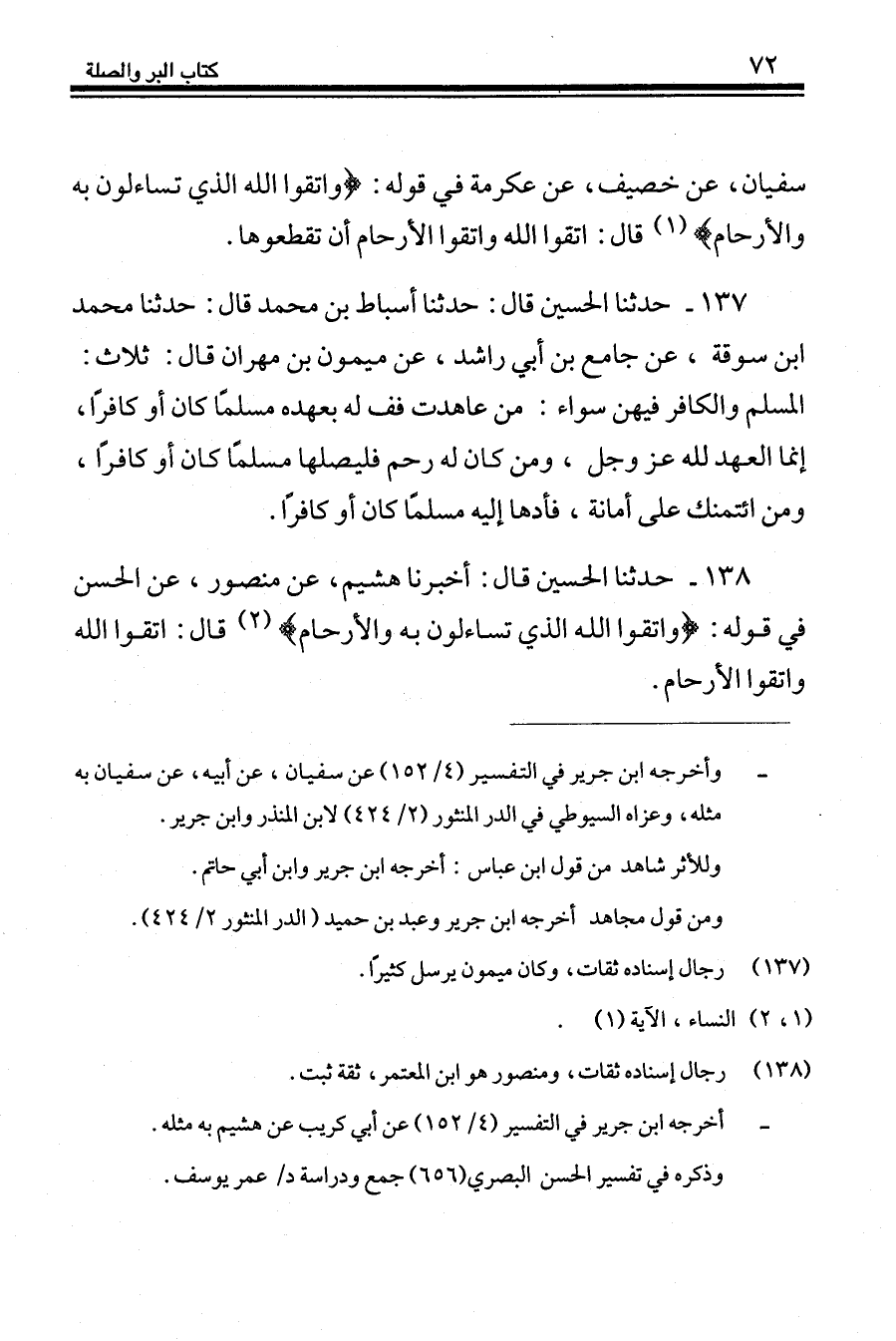 138 - حَدَّثَنَا الْحُسَيْنُ قَالَ: أَخْبَرَنَا هُشَيْمٌ، عَنْ مَنْصُورٍ، عَنِ الْحَسَنِ، فِي قَوْلِهِ: {§وَاتَّقُوا اللَّهَ الَّذِي تَسَاءَلُونَ بِهِ وَالْأَرْحَامَ} [النساء: 1] قَالَ: «اتَّقُوا اللَّهَ وَاتَّقُوا الْأَرْحَامَ»