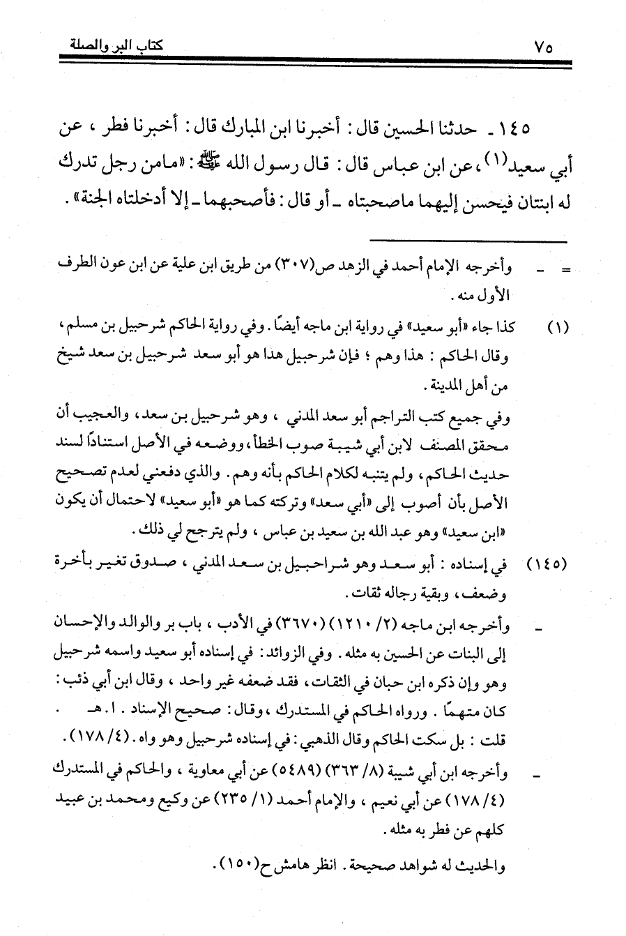 145 - حَدَّثَنَا الْحُسَيْنُ قَالَ: أَخْبَرَنَا ابْنُ الْمُبَارَكِ، قَالَ: أَخْبَرَنَا فِطْرٌ، عَنْ أَبِي سَعْدٍ، عَنِ ابْنِ عَبَّاسٍ، قَالَ: قَالَ رَسُولُ اللَّهِ صَلَّى اللهُ عَلَيْهِ وَسَلَّمَ: " §مَا مِنْ رَجُلٍ تُدْرَكُ لَهُ ابْنَتَانِ فَيُحْسِنُ إِلَيْهِمَا مَا صَحِبَتَاهُ - أَوْ قَالَ: فَأَصْحَبَهُمَا - إِلَّا أَدْخَلَتَاهُ الْجَنَّةَ "