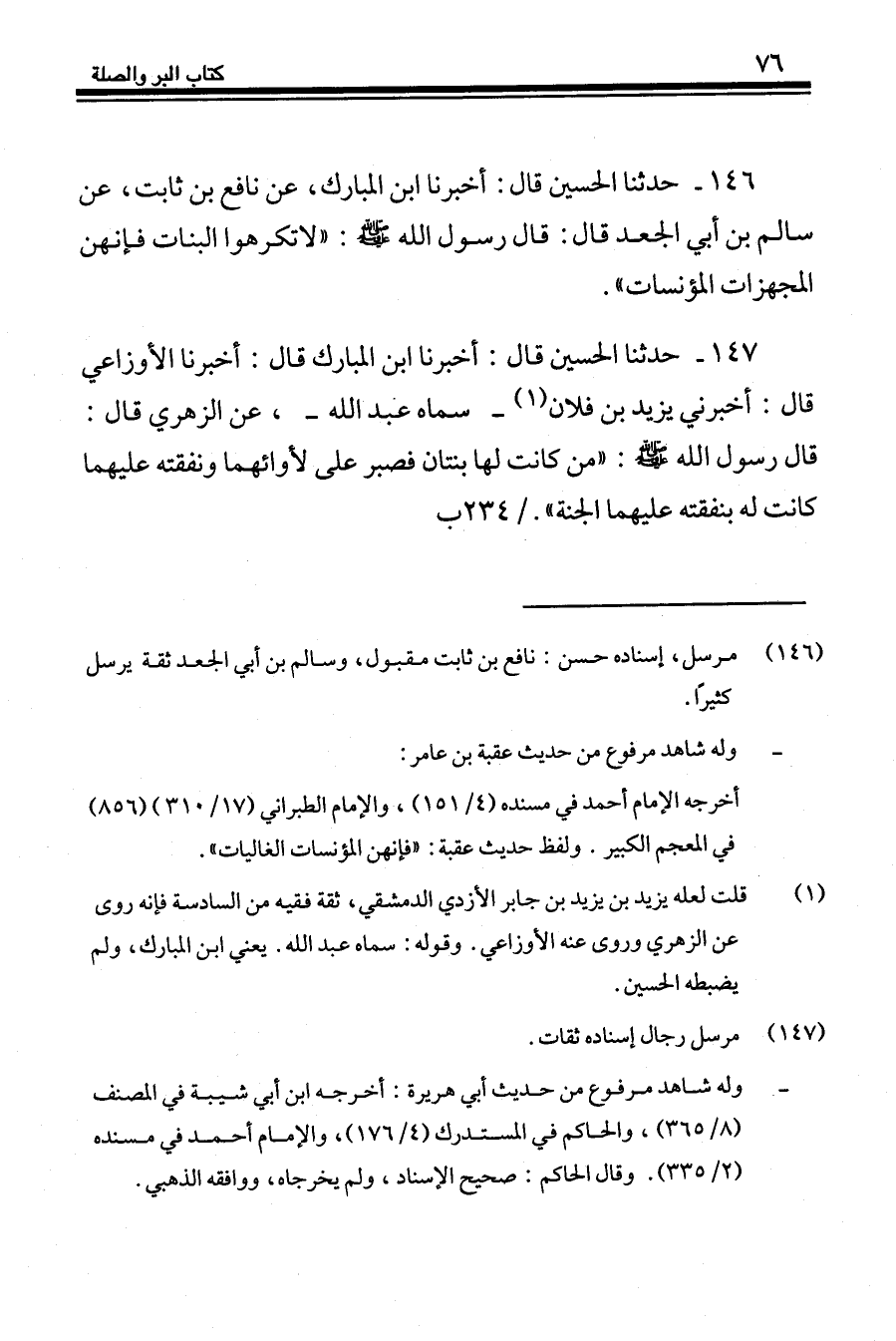 146 - حَدَّثَنَا الْحُسَيْنُ قَالَ: أَخْبَرَنَا ابْنُ الْمُبَارَكِ، عَنْ نَافِعِ بْنِ ثَابِتٍ، عَنْ سَالِمِ بْنِ أَبِي الْجَعْدِ، قَالَ: قَالَ رَسُولُ اللَّهِ صَلَّى اللهُ عَلَيْهِ وَسَلَّمَ: «§لَا تُكْرِهُوا الْبَنَاتِ فَإِنَّهُنَّ الْمُجَهِّزَاتُ الْمُؤْنِسَاتُ»