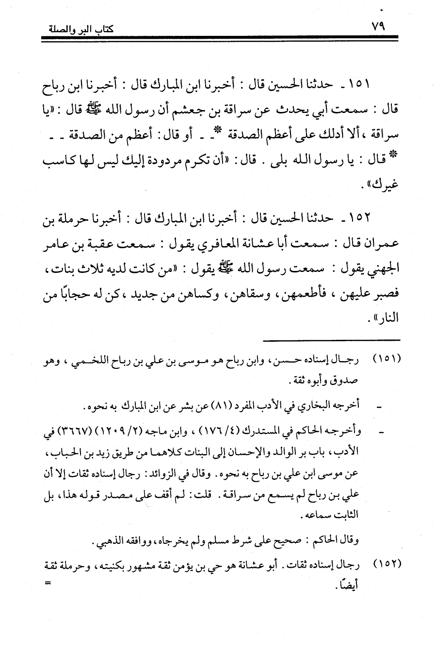 151 - حَدَّثَنَا الْحُسَيْنُ قَالَ: أَخْبَرَنَا ابْنُ الْمُبَارَكِ، قَالَ: أَخْبَرَنَا ابْنُ رَبَاحٍ، قَالَ: سَمِعْتُ أَبِي يُحَدِّثُ، عَنْ سُرَاقَةَ بْنِ جُعْشُمٍ، أَنَّ رَسُولَ اللَّهِ صَلَّى اللهُ عَلَيْهِ وَسَلَّمَ قَالَ: " يَا سُرَاقَةُ، أَلَا أَدُلُّكَ عَلَى أَعْظَمِ الصَّدَقَةِ، أَوْ قَالَ: أَعْظَمَ مِنَ الصَّدَقَةِ؟ " قَالَ: يَا رَسُولَ اللَّهِ بَلَى. قَالَ: «§أَنْ تُكْرِمَ مَرْدُودَةً إِلَيْكَ لَيْسَ لَهَا كَاسِبٌ غَيْرُكَ»