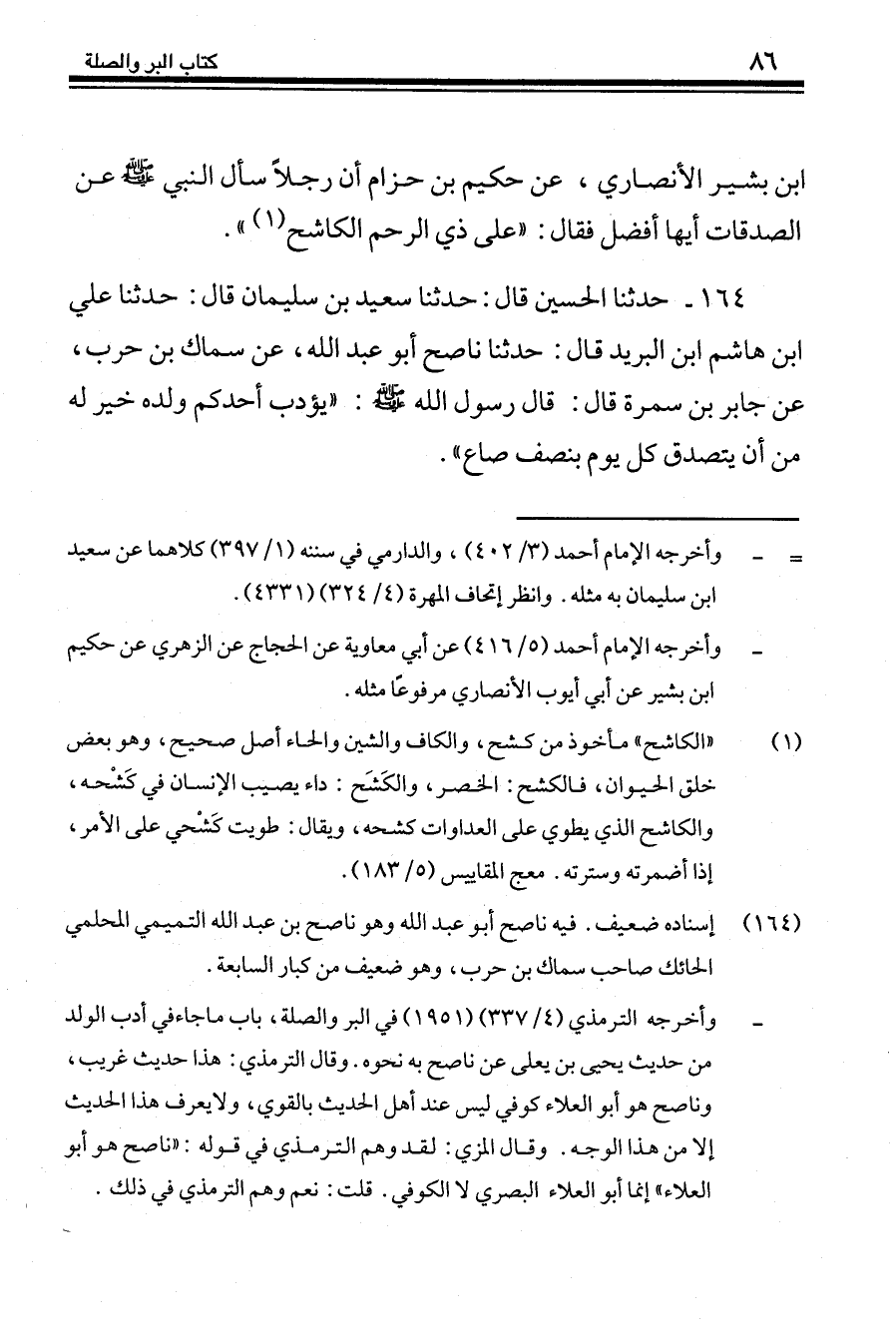164 - حَدَّثَنَا الْحُسَيْنُ قَالَ: حَدَّثَنَا سَعِيدُ بْنُ سُلَيْمَانَ، قَالَ: حَدَّثَنَا عَلِيُّ بْنُ هَاشِمِ بْنِ الْبَرِيدِ، قَالَ: حَدَّثَنَا نَاصِحٌ أَبُو عَبْدِ اللَّهِ، عَنْ سِمَاكِ بْنِ حَرْبٍ، عَنْ جَابِرِ بْنِ سَمُرَةَ، قَالَ: قَالَ رَسُولُ اللَّهِ صَلَّى اللهُ عَلَيْهِ وَسَلَّمَ: «§يُؤَدِّبُ أَحَدُكُمْ وَلَدَهُ خَيْرٌ لَهُ مِنْ أَنْ يَتَصَدَّقَ كُلَّ يَوْمٍ بِنِصْفِ صَاعٍ»