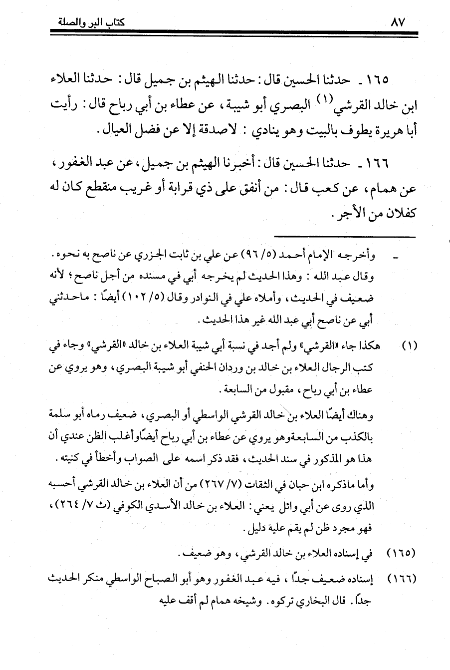 165 - حَدَّثَنَا الْحُسَيْنُ قَالَ: حَدَّثَنَا الْهَيْثَمُ بْنُ جَمِيلٍ، قَالَ: حَدَّثَنَا الْعَلَاءُ بْنُ خَالِدٍ الْقُرَشِيُّ الْبَصْرِيُّ أَبُو شَيْبَةَ، عَنْ عَطَاءِ بْنِ أَبِي رَبَاحٍ، قَالَ: رَأَيْتُ أَبَا هُرَيْرَةَ يَطُوفُ بِالْبَيْتِ وَهُوَ يُنَادِي: «§لَا صَدَقَةَ إِلَّا عَنْ فَضْلِ الْعِيَالِ»