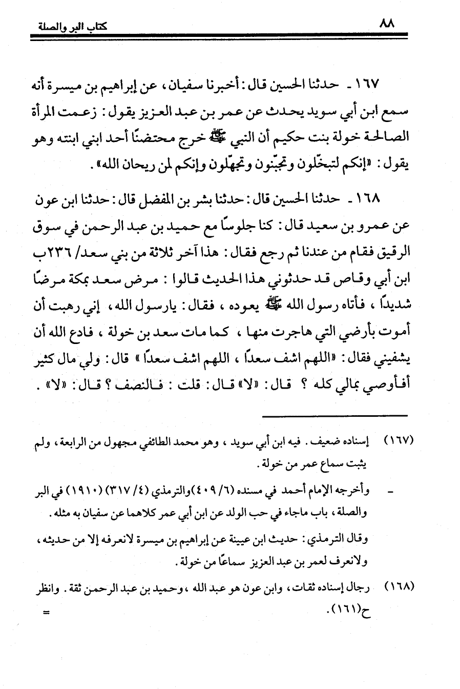168 - حَدَّثَنَا الْحُسَيْنُ قَالَ: حَدَّثَنَا بِشْرُ بْنُ الْمُفَضَّلِ، قَالَ: حَدَّثَنَا ابْنُ عَوْنٍ، عَنْ عَمْرِو بْنِ سَعِيدٍ، قَالَ: كُنَّا جُلُوسًا مَعَ حُمَيْدِ بْنِ عَبْدِ الرَّحْمَنِ فِي سُّوقِ الرَّقِيقِ، فَقَامَ مِنْ عِنْدِنَا، ثُمَّ رَجَعَ، فَقَالَ: هَذَا آخِرُ ثَلَاثَةٍ مِنْ بَنِي سَعْدِ بْنِ أَبِي وَقَّاصٍ قَدْ حَدِّثُونِي هَذَا الْحَدِيثَ؛ قَالُوا: مَرِضَ سَعْدٌ بِمَكَّةَ مَرَضًا شَدِيدًا، فَأَتَاهُ رَسُولُ اللَّهِ صَلَّى اللهُ عَلَيْهِ وَسَلَّمَ يَعُودُهُ، فَقَالَ: يَا رَسُولَ اللَّهِ، إِنَّي رَهِبْتُ أَنْ أَمُوتَ بِأَرْضِي الَّتِي هَاجَرْتُ مِنْهَا كَمَا مَاتَ سَعْدُ بْنُ خَوْلَةَ، فَادْعُ اللَّهَ أَنْ يَشْفِيَنِي فَقَالَ: «§اللَّهُمَّ اشْفِ سَعْدًا اللَّهُمَّ اشْفِ سَعْدًا» قَالَ: وَلِي مَالٌ كَثِيرٌ، أَفَأُوصِي بِمَالِي كُلِّهِ؟ قَالَ: «لَا» قَالَ: قُلْتُ فَالنِّصْفِ؟ قَالَ: «لَا» -[89]-، قُلْتُ: فَالثُّلُثِ؟ قَالَ: " الثُّلُثُ وَالثُّلُثُ كَثِيرٌ إِنَّ صَدَقَتَكَ مِنْ مَالِكَ لَكَ صَدَقَةٌ، وَإِنَّ أَكْلَ امْرَأَتِكَ مِنْ طَعَامِكَ صَدَقَةٌ، وَأَنَّ نَفَقَتَكَ عَلَى أَهْلِكَ مِنْ مَالِكَ لَكَ صَدَقَةٌ، وَإِنَّكَ أَنْ تَدَعَ أَهْلَكَ بِعَيْشٍ، أَوْ قَالَ: بِغِنًى، خَيْرٌ لَكَ مِنْ أَنْ تَدَعَهُمْ يَتَكَفَّفُونَ "