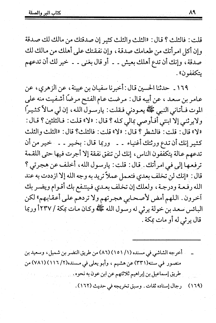 169 - حَدَّثَنَا الْحُسَيْنُ قَالَ: أَخْبَرَنَا سُفْيَانُ بْنُ عُيَيْنَةَ، عَنِ الزُّهْرِيِّ، عَنْ عَامِرِ بْنِ سَعْدٍ، عَنْ أَبِيهِ، قَالَ: مَرِضْتُ عَامَ الْفَتْحِ مَرَضًا أُشْفِيتُ مِنْهُ عَلَى الْمَوْتِ، فَأَتَانِي النَّبِيُّ صَلَّى اللهُ عَلَيْهِ وَسَلَّمَ يَعُودُنِي، فَقُلْتُ: يَا رَسُولَ اللَّهِ إِنَّ لِيَ مَالًا كَثِيرًا، وَلَا يَرِثُنِي إِلَّا ابْنَتِي أَفَأُوصِي بِمَالِي كُلِّهِ؟ قَالَ «لَا» ، قُلْتُ: فَالثُّلُثَيْنِ؟ قَالَ: «لَا» قُلْتُ: فَالشَّطْرِ؟ قَالَ «لَا» ، قُلْتُ: فَالثُّلُثِ؟ قَالَ: " §الثُّلُثُ وَالثُّلُثُ كَثِيرٌ، إِنَّكَ أَنْ تَدَعَ وَرَثَتَكَ أَغْنِيَاءَ - وَرُبَّمَا قَالَ: بِخَيْرٍ - خَيْرٌ مِنْ أَنْ تَدَعَهُمْ عَالَةً يَتَكَفَّفُونَ النَّاسَ، إِنَّكَ لَنْ تُنْفِقَ نَفَقَةً إِلَّا أُجِرْتَ فِيهَا، حَتَّى اللُّقْمَةَ تَرْفَعُهَا إِلَى فِي امْرَأَتِكَ ". قَالَ: قُلْتُ يَا رَسُولَ اللَّهِ أُخَلَّفُ عَنْ هِجْرَتِي؟ قَالَ: «إِنَّكَ لَنْ تُخَلَّفَ بَعْدِي فَتَعْمَلَ عَمَلًا تُرِيدُ بِهِ وَجْهَ اللَّهِ إِلَّا ازْدَدْتَ بِهِ عِنْدَ اللَّهِ رِفْعَةً وَدَرَجَةً، وَلَعَلَّكَ أَنْ تُخَلَّفَ بَعْدِي فَيَنْتَفِعَ بِكَ أَقْوَامٌ وَيُضَرَّ بِكَ آخَرُونَ. اللَّهُمَّ أَمْضِ لِأَصْحَابِي هِجْرَتَهُمْ وَلَا تَرُدَّهُمْ عَلَى أَعْقَابِهِمْ» ، لَكِنِ الْبَائِسُ سَعْدُ بْنُ خَوْلَةَ يَرْثِي لَهُ رَسُولُ اللَّهِ صَلَّى اللهُ عَلَيْهِ وَسَلَّمَ وَكَانَ مَاتَ بِمَكَّةَ، وَرُبَّمَا قَالَ يَرْثِي لَهُ أَنْ مَاتَ بِمَكَّةَ "