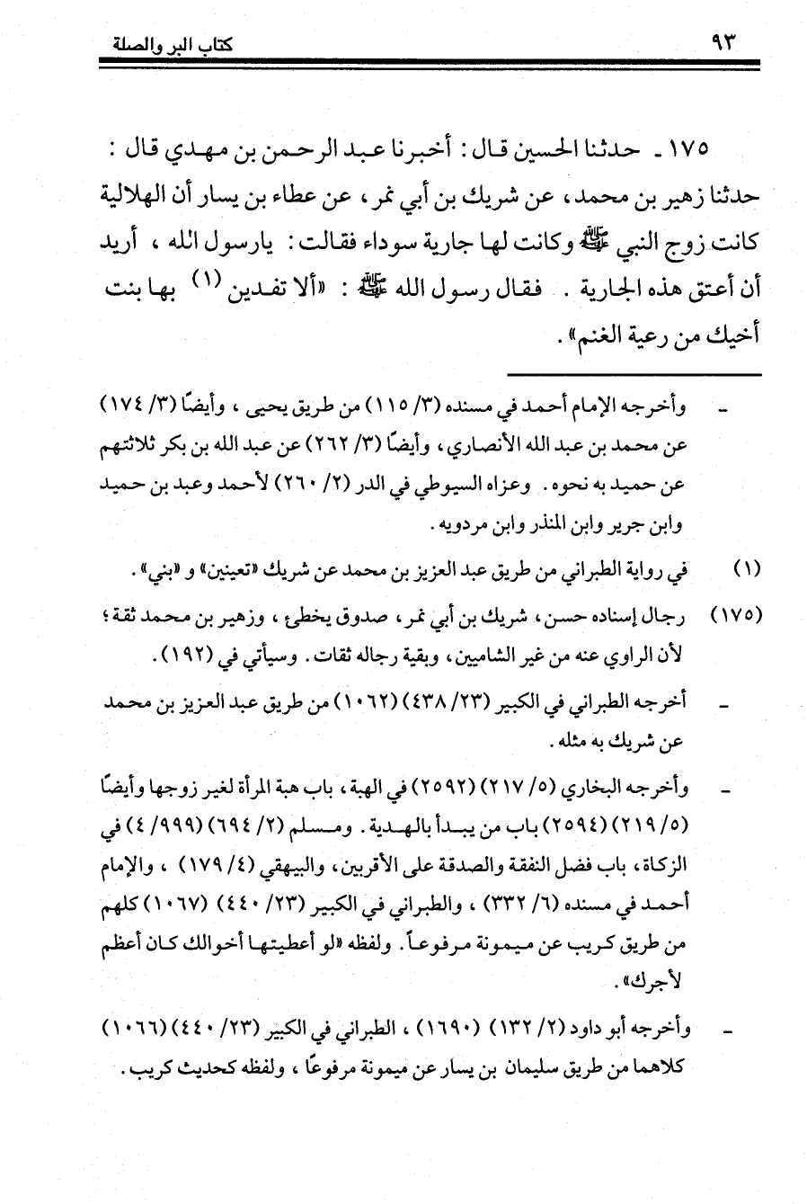175 - حَدَّثَنَا الْحُسَيْنُ قَالَ: أَخْبَرَنَا عَبْدُ الرَّحْمَنِ بْنُ مَهْدِيٍّ، قَالَ: حَدَّثَنَا زُهَيْرُ بْنُ مُحَمَّدٍ، عَنْ شَرِيكِ بْنِ أَبِي نَمِرٍ , عَنْ عَطَاءِ بْنِ يسَّارٍ، أَنَّ الْهِلَالِيَّةَ، كَانَتْ زَوْجُ النَّبِيِّ صَلَّى اللهُ عَلَيْهِ وَسَلَّمَ، وَكَانَتْ لَهَا جَارِيَةٌ سَوْدَاءُ، فَقَالَتْ: يَا رَسُولَ اللَّهِ أُرِيدُ أَنْ أَعْتِقَ هَذِهِ الْجَارِيَةَ، فَقَالَ رَسُولُ اللَّهِ صَلَّى اللهُ عَلَيْهِ وَسَلَّمَ: «§أَلَا تَفْدِينَ بِهَا بِنْتَ أَخِيكِ مِنْ رَعِيَّةِ الْغَنَمِ»