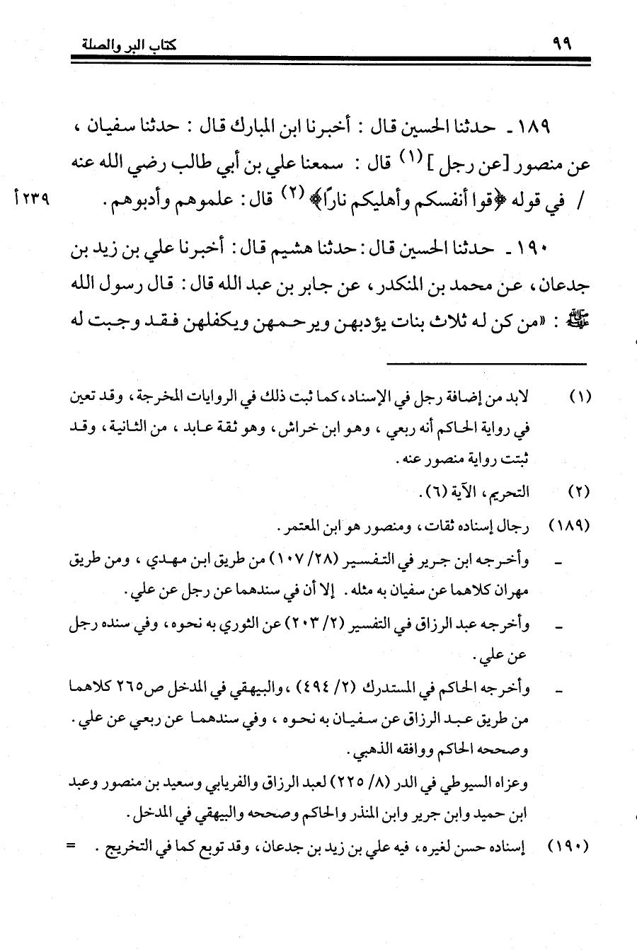 189 - حَدَّثَنَا الْحُسَيْنُ قَالَ: أَخْبَرَنَا ابْنُ الْمُبَارَكِ، قَالَ: حَدَّثَنَا سُفْيَانُ، عَنْ مَنْصُورٍ عَنْ رَجُلٍ، قَالَ: سَمِعْنَا عَلِيَّ بْنَ أَبِي طَالِبٍ، رَضِيَ اللَّهُ عَنْهُ فِي قَوْلِهِ: " {§قُوا أَنْفُسَكُمْ وَأَهْلِيكُمْ نَارًا} [التحريم: 6] قَالَ: عَلِّمُوهُمْ وَأَدِّبُوهُمْ "
